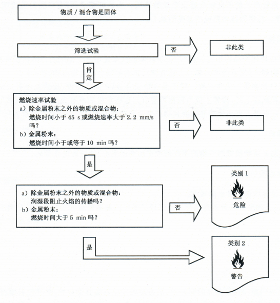 该程序由两个试验组成:初步筛选试验和燃烧速率试验。易燃固体分类判定逻辑图如下: