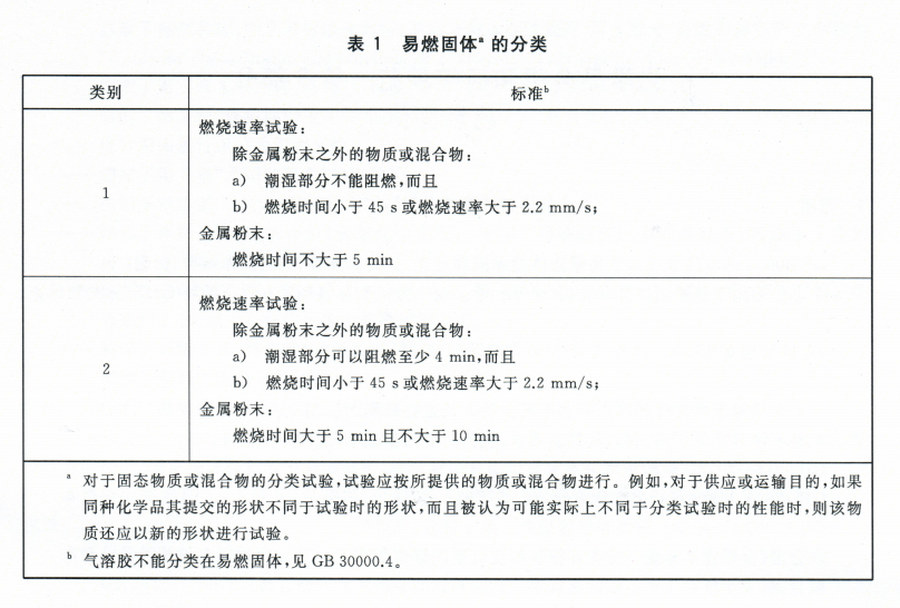 易燃固体根据联合国《关于危险货物运输的建议书:试验和标准手册》(第五修订版)第三部分第33.2.1中N.1试验分为2类,具体如下所示: