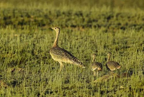 (在草原上的大鸨母子。直到今天,大鸨仍是草原生态的关键指示物。同时,由于栖息地越来越少,大鸨也会被迫来到麦地等农田区域生活,这恰恰给她们带来了致命的威胁。摄影许传辉)