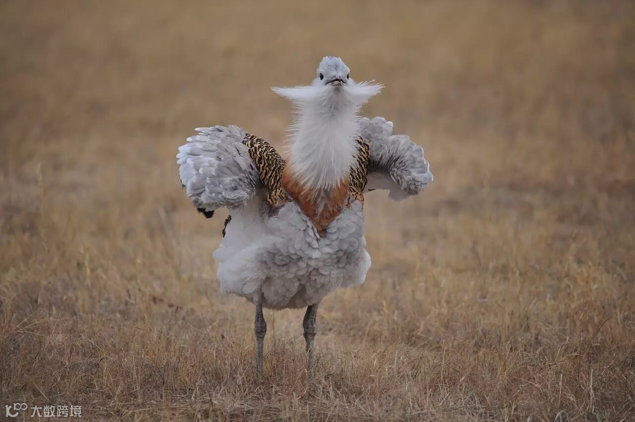 (大鸨是世界上最重的飞行鸟类,繁殖季的雄性大鸨也被叫做“羊须鸨”。由于盗猎、农药、栖息地破坏等原因,目前大鸨可能全球不足800只。 图/付建国)