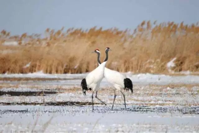 丹顶鹤的求偶非常精彩。雄鹤常在雌鹤周围摆动羽翅,翩翩起舞,以赢得雌鹤的欢心。