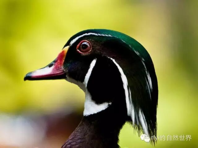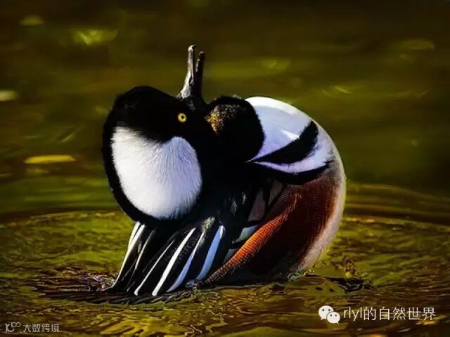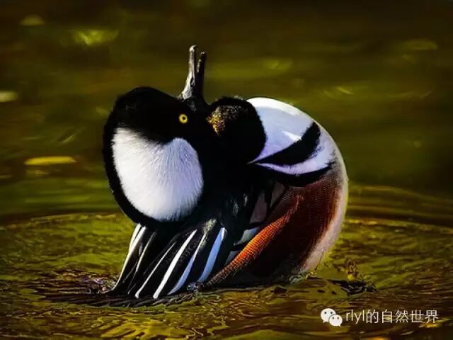 棕肋秋沙鸭羽冠与绝大多数鸟类不同,蓬松成镜状,白色斑羽四周环绕着界限分明的黑边,可以说这顶冠羽又是大自然的神来之笔。该鸟种常在湖边林木树洞中筑巢,是少数会飞到树上筑巢的水鸭之一,现在数量不多,已被列入世界自然保护联盟名录当中。