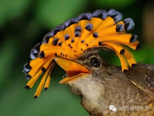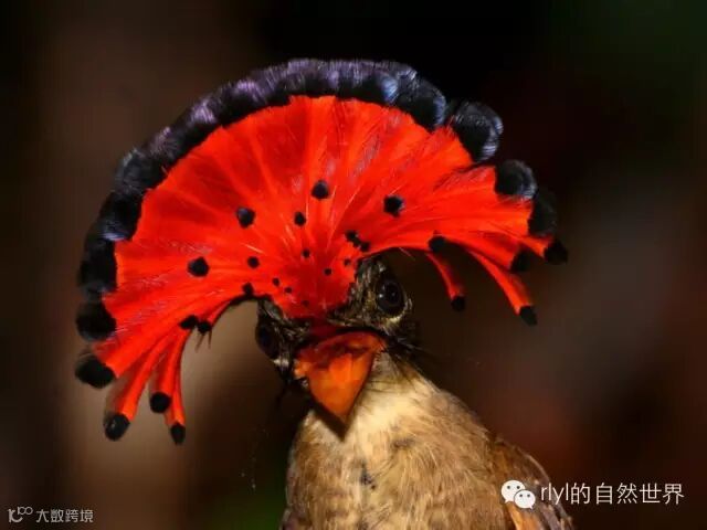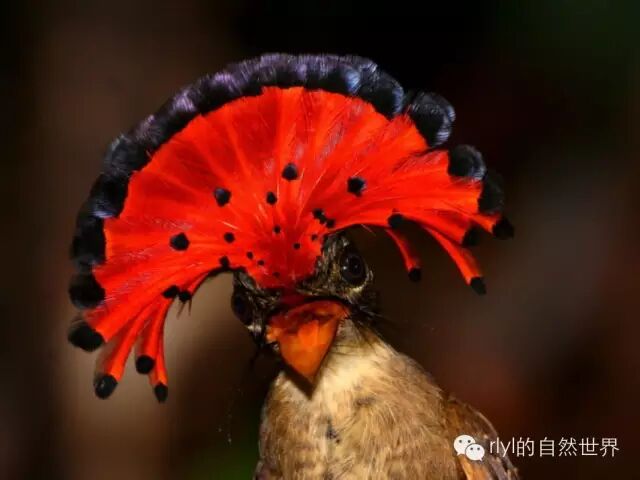 皇 霸鶲,也有的称为皇家鹟,为雀形目霸鶲科皇霸鶲属单一物种,仅分布于北美洲南部至亚马逊雨林及巴西东南角,共4个亚种,也有的将4个亚种独立成种。其中亚 马逊皇霸鶲栖息亚马逊的热带雨林,体型虽小,但雄鸟的羽冠极为华丽,展开时横向呈扇状,羽冠呈黄色或红色,边缘带有黑色斑纹,扇状羽冠还有黑色斑点,可以 说是雀鸟中最夸张最漂亮的鸟冠。