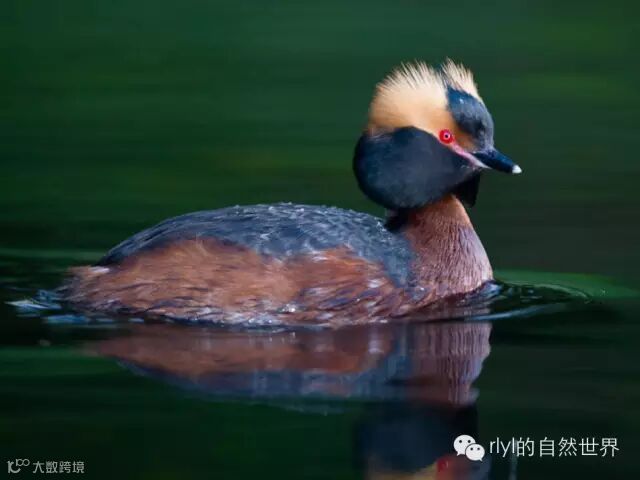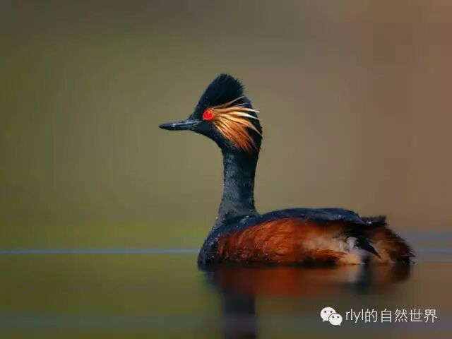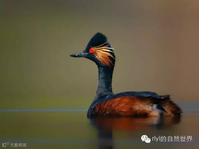 角䴙䴘,中型游禽,嘴短呈黑色,又直又尖,尖端呈黄白色,翅膀短而圆,尾巴短,同凤头䴙䴘善游泳不善行走。角䴙䴘的夏羽头部、后颈和背部的羽毛均为黑色,前颈、颈侧、胸部和体侧是栗红色,下嘴的基部到眼睛有一条淡色的纹,眼睛里的虹膜为红色,从眼睛前面开始向眼后方的两侧各有一簇金栗色的饰羽丛伸向头的后部,呈双角状,极为醒目,故名“角䴙䴘”。