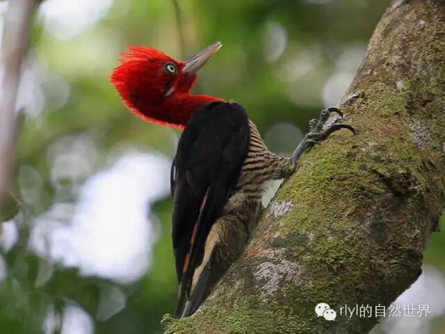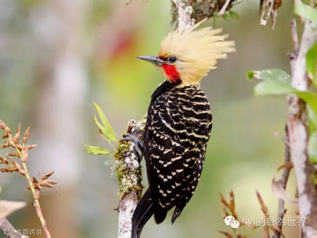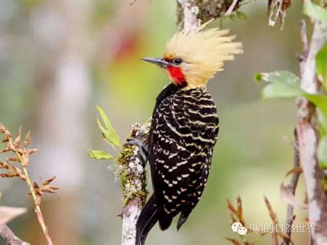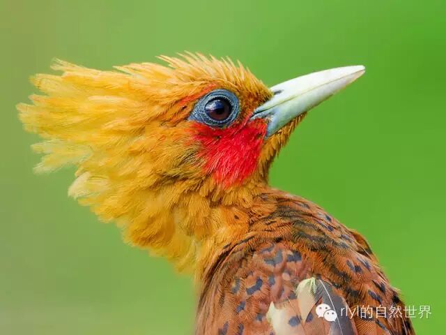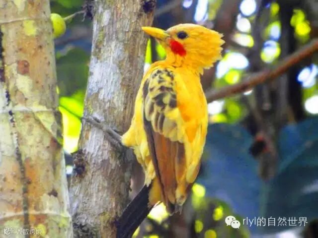 冠啄木鸟种类冠羽很像刷子,常见色有红色、黄色等色,搭配上啄木鸟的身体色彩,非常醒目而耐看,如乳脂色冠啄木鸟(见上图),除翅膀和尾羽为浅棕色外,通体金黄,雄鸟与雌鸟的区别在于颊下方为红色,栖息于南美森林地区,常在河流附近森林活动。