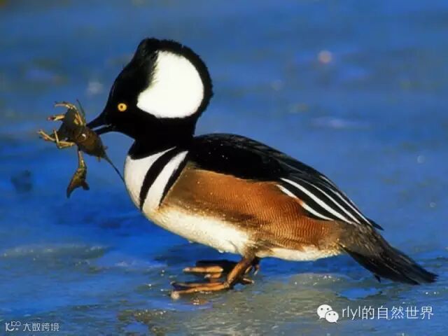 棕肋秋沙鸭,别名镜冠秋沙鸭,雁形目鸭科镜冠秋沙鸭属单一物种,体型较小,体长42-50厘米,翼展56-70厘米,是北美最小的水鸭。身体色彩较明艳,身上羽毛有白、棕、黑三色组成,最漂亮的是雄鸭有独特的羽冠,是典型的庞克头。