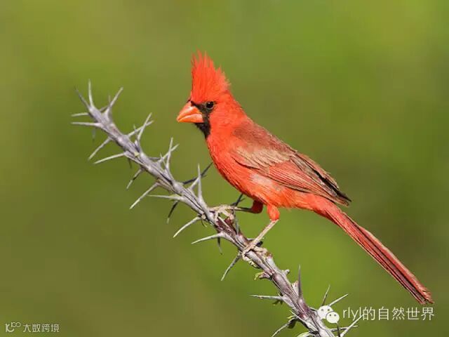 北美红雀,别名红衣主教,雀形目红鸟科红鸟属(主红雀属)著名鸟种。北美红雀的羽冠单看很常见,冠红蜡嘴鹀等鸟类也有如此漂亮的羽冠,但北美红雀高耸的红色羽冠与红色体羽融为一体,与面颊的黑色形成极为强烈的对比,使得这种鸟种非常上镜。