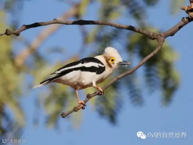 白 盔鵙,别名白凤头盔伯劳、长冠盔鵙,雀形目盔鵙科(或伯盔鵙科作为劳科1属)盔鵙属常见鸟种,盔鵙属的鸟类冠羽比较有特点,如黄冠盔鵙、灰冠盔鵙等。白盔 鵙体型中等,面部白色,喙黑色,眼四周的眼圈金黄色突出,头冠白色,长而卷曲,颈部灰色,翅膀黑色有白色条纹,腹部白色,腿粉红色。