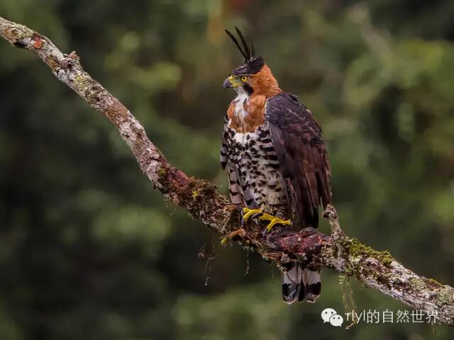 饰 冠鹰雕羽冠代表了猛禽类另一种著名的发型,数根长羽从密集的短羽冠中突起,极为醒目。饰冠鹰雕分布于墨西哥南部尤卡坦半岛、特立尼达和多巴哥、秘鲁、阿根 廷等广袤地区,多栖息于热带潮湿的 山地、林地,主要鸟类为食,包括凤冠雉、鸠鸽、小蓝鹭、金刚鹦鹉等,也经常捕食刺豚鼠、松鼠、老鼠、浣熊、猴子,有时猎杀爬行类。饰冠鹰雕的羽色较绝大多 数猛禽鲜艳,头部有着非常漂亮的半月型头冠,雄雕求偶时折叠翅膀俯冲、爬升来炫耀自己,虽分布区域广泛,但在本地稀有,已列为濒危物种。