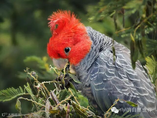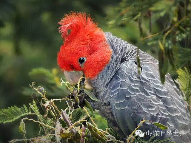 红冠凤头鹦鹉体长33-35厘米,体重240-330克,鸟喙强劲有力,喙钩曲,上颌具有可活动关节,雄鸟头部红色,羽毛灰色,羽 毛齿痕浅灰色或白色,雌鸟灰色,分布在澳大利亚的东南部,主要生活在较高纬度的老桉树森林,在冬天会到比较低纬度的森林中。红冠凤头鹦鹉群居,只有喝水的时候会到地面上来,很友善也很容易信任人类,在觅食的时候非常容易接近,甚至可以近到伸手触及的距离。