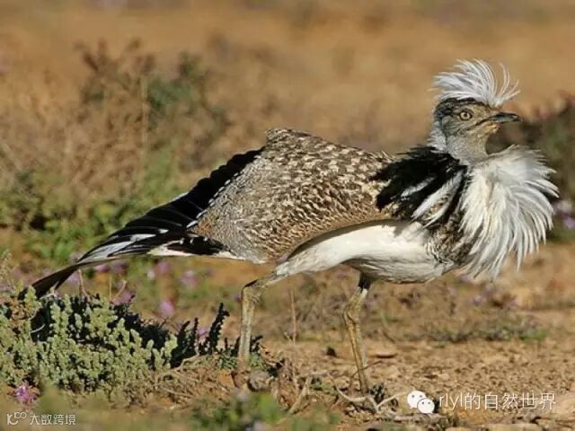 波斑鸨和近亲翎颌鸨外形相似,也均为栖息于荒漠和半荒漠的鸟类。波斑鸨全长约 70厘米,两性羽色相似,外形似鸡,但仅具3趾。波斑鸨和流苏鹬走的路线相同,发达的羽冠虽不如流苏鹬夸张多变,但波斑鸨羽冠细长如绒毛飘舞,配上胸前夸张的饰羽,使得雄鸟繁殖期也极为耀眼。