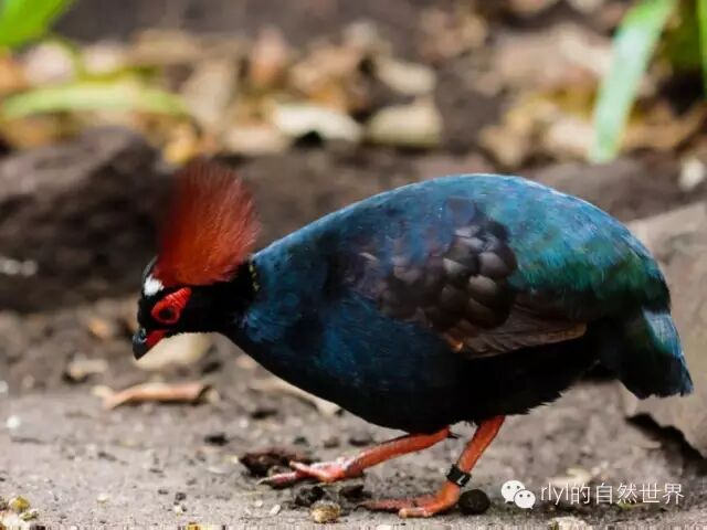 冕鹧鸪,鸡形目雉科冕鹧鸪属单一物种,体长约26厘米,雄性体重240-300克左右,雌性体重约225-275克。雌雄与其他雉类差异较大不同,雌雄都长 着红眼圈,喙附近长着细长的须,均具有漂亮的羽色。雄性整体呈带有光泽的蓝紫色,背部略显浅绿色,头上生有一撮艳丽的鲜红色羽毛,腿为赤红色;雌鸟除翅膀 呈红褐色外浑身翠绿。