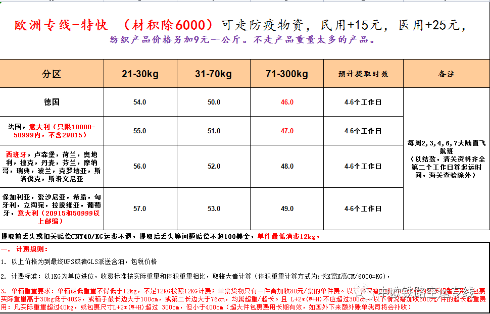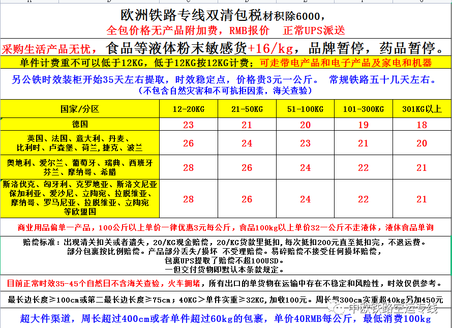 中国货物铁路,空运到欧洲六国(英国,法国,德国,西班牙,意大利)。 欧洲ups派送到门,包税清关,无需客户支付任何税费。