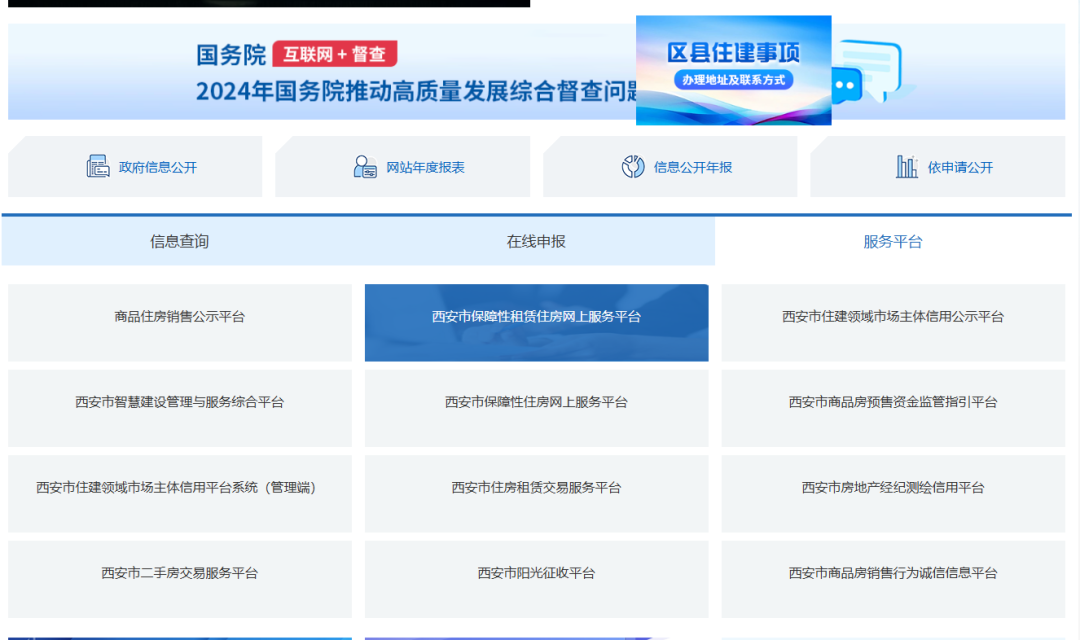 步骤一 登陆“西安市住房和城乡建设局”官网,下拉点击“服务平台”栏目跳转至西安市保障性租赁住房网上服务平台,如下图所示。
