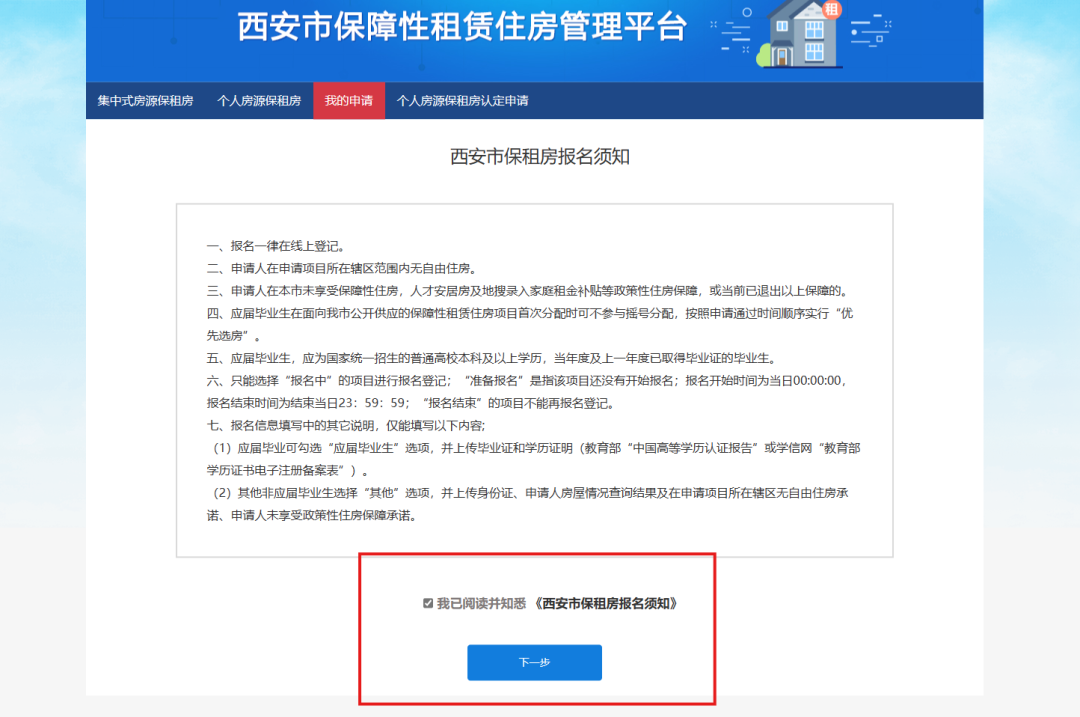 步骤五 完成登录后,阅读《西安市保租房报名须知》并勾选“已阅读并知悉”, 点击【下一步】按钮,如下图所示。