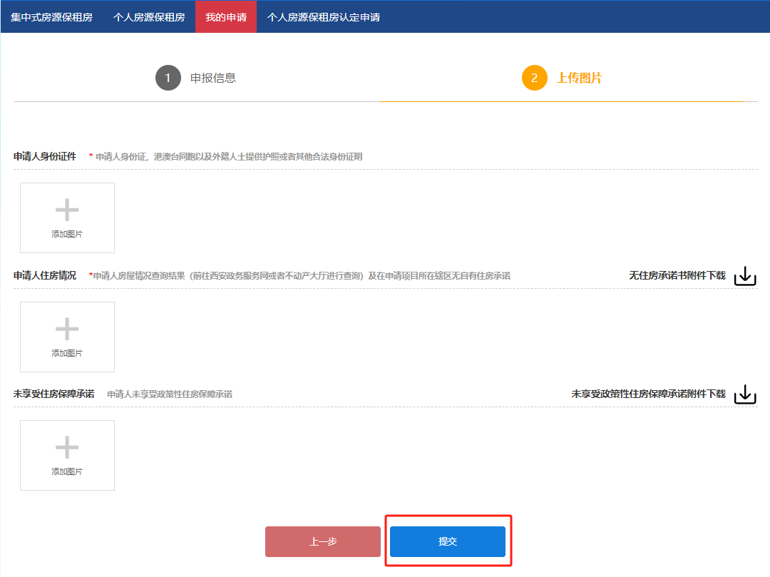 步骤七 进入“上传资料”页面后,“申请人身份证件”、“申请人住房情况”及“未享受住房政策承诺”均为必传内容, 点击【+】添加要件图片,其中“申请人身份证件”需上传正反面,上传信息后点击【提交】按钮,如下图所示。