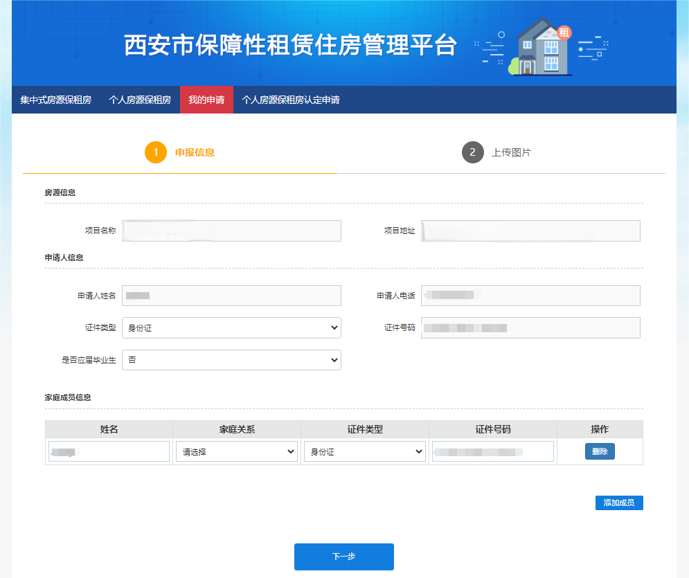 步骤六 进入“申报信息”填写页面后,个人信息会根据登录人的信息自动回填。在填写“家庭成员信息”时,需要选择“家庭关系”。如需添加家庭各成员,则点击【添加成员】按钮,录入家庭成员信息。信息全部录入完成后,点击【下一步】按钮,如下图所示。