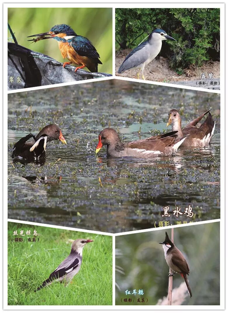 红耳鹎、白头鹎、乌鸫、鹊鸲、八哥、普通翠鸟、夜鹭、池鹭、黑水鸡、小䴙䴘