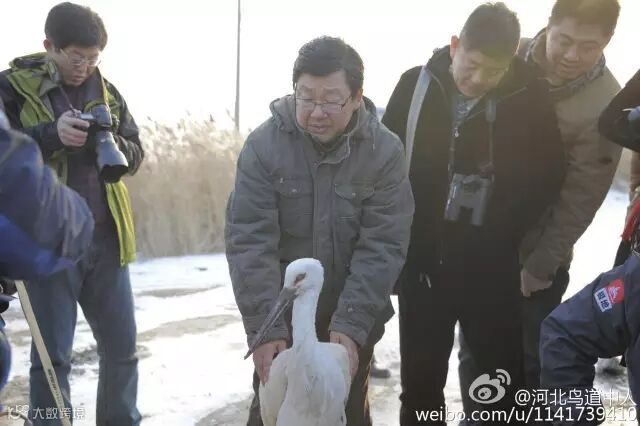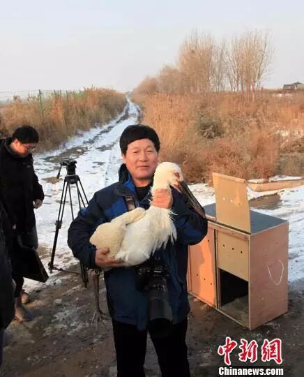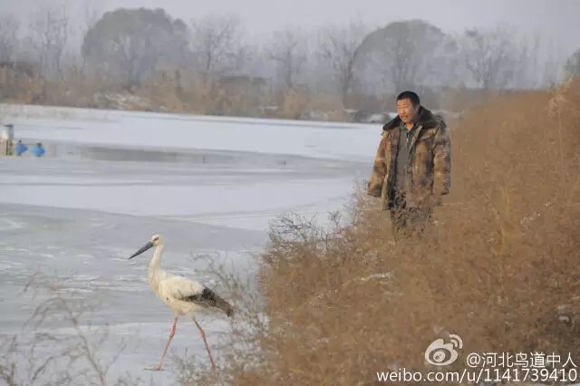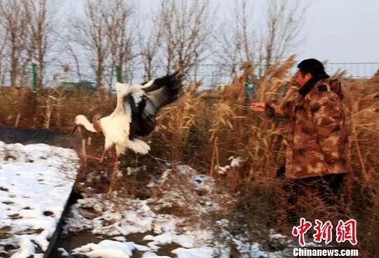 乐亭县长芦大清河盐场野生动物救护站站长田志伟老师,目送东方白鹳离开