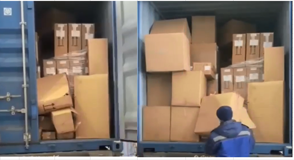 该集装箱箱内部分货物直接堆码到托盘上,无其他有效加固措施,未形成一个整体的包装单元,未进行有效的托盘化处理。在无任何加固措施的情况下,因运输途中弯道、制动、加速及其他原因产生的各种力的作用,未加固的纸箱货物从托盘上倒垛、散落、倾覆及窜动,同时将部分托盘一体化货物冲散,箱内货物整体杂乱无章。