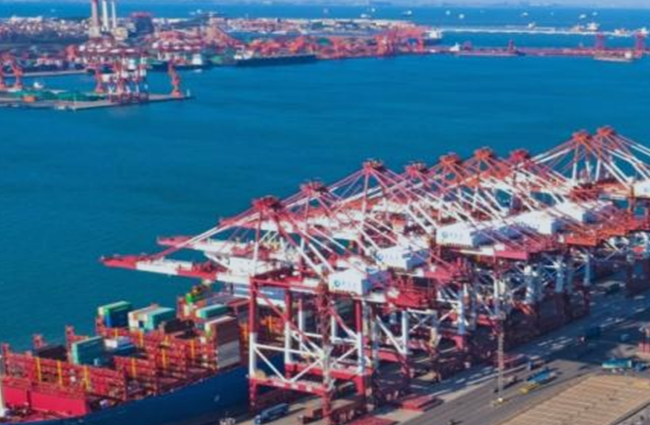 青岛港位于山东半岛胶州湾畔,濒临黄海,与日本和朝鲜半岛隔海相望,是中国第二大外贸口岸,同时也是中国沿黄河流域和环太平洋西岸的国际贸易口岸和中转枢纽,拥有的集装箱航线超过170条,航线密度稳居中国北方港口首位。其与全球180多个国家和地区的700多个港口保持贸易往来,航运线路实现了对“海上丝绸之路”沿线国家的全覆盖,集装箱、铁矿石、纸浆等货种作业效率位列世界第一,2020年青岛港集装箱吞吐量超越釜山港,位居世界第六。青岛港自动化码头是亚洲首个效率最高的全自动化码头,平均效率是全球自动化码头的两倍以上,是“中国效率”在世界港航界的代名词,近年来,青岛港已然成为集装箱国际航线保班、纠班的首选。