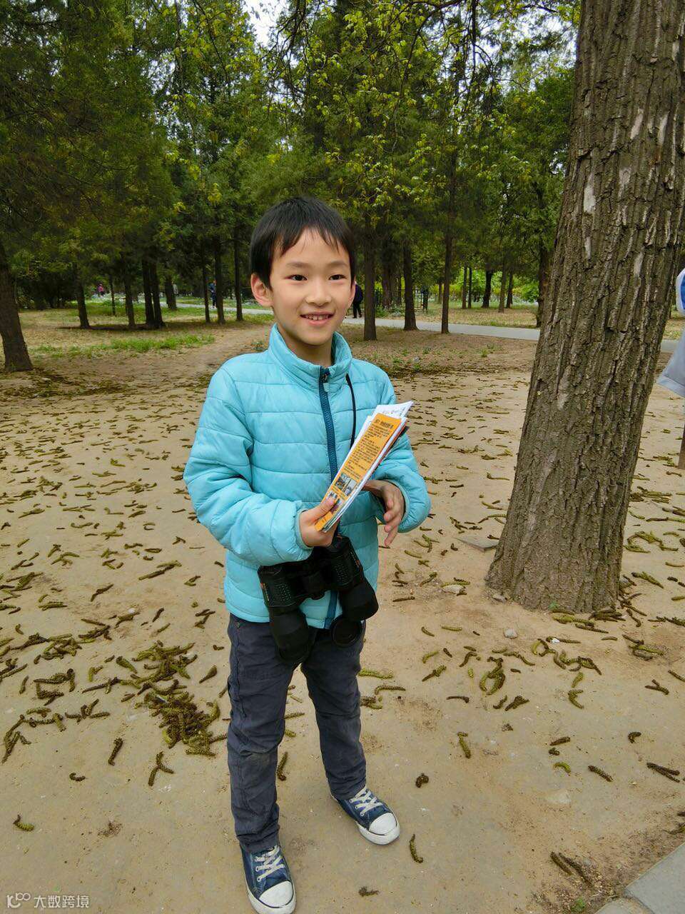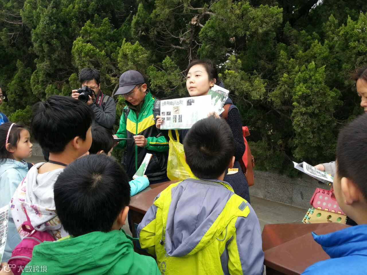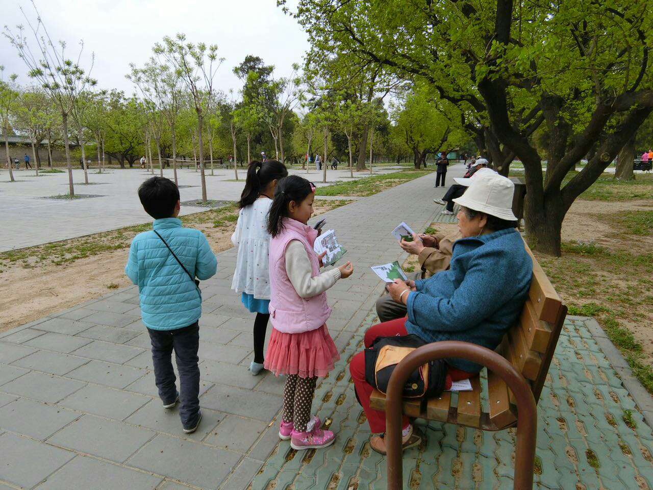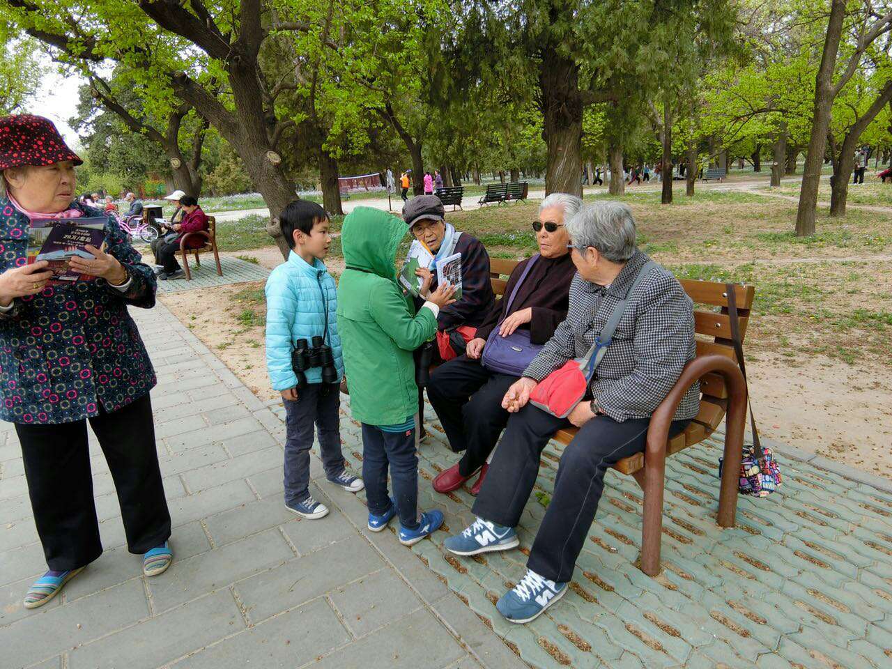 孩子们全部动员起来,在苗圃周边给锻炼的叔叔阿姨爷爷奶奶们发护鸟折页。