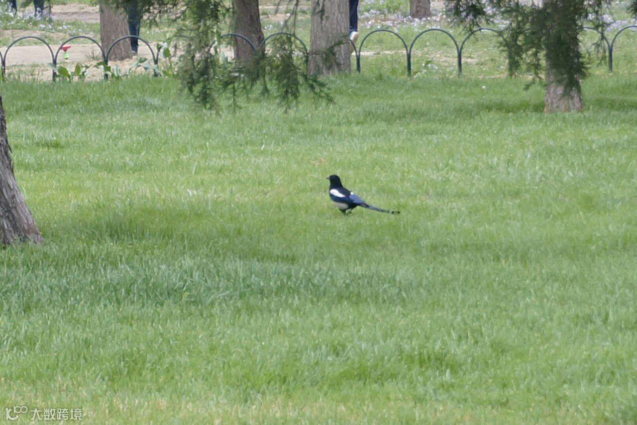 ▲我们在草坪上看到了一只蹦蹦跳跳的喜鹊。