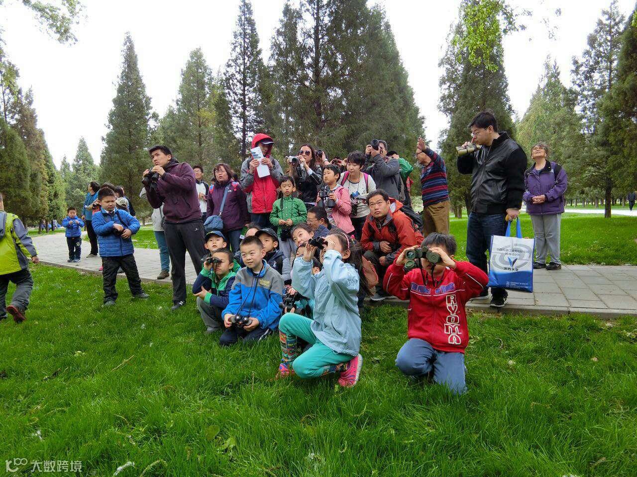 ▲用望远镜观察八哥和黑尾蜡嘴雀。