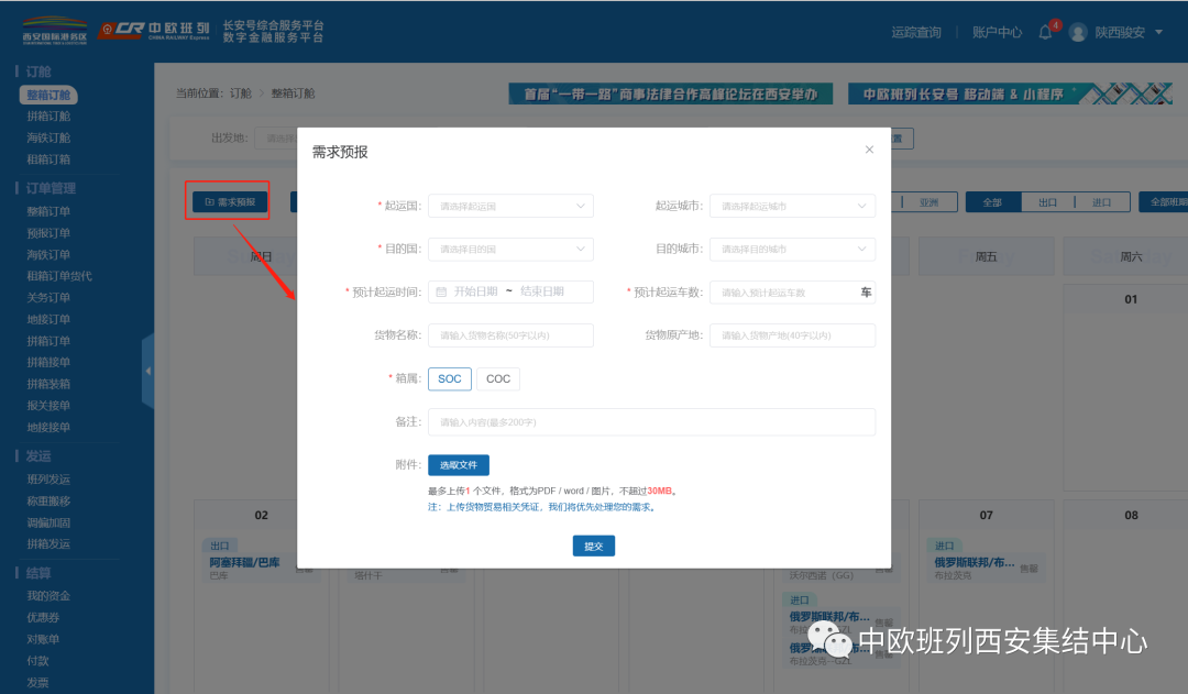登录中欧班列长安号综合服务平台www.caexp.net,点击日历上方【需求预报】按钮,在弹窗中将必填项填写完成,点击【提交】按钮,提示“需求预报提交成功”,并跳转至【需求订单】页面。(注:时间可选择具体日期天或时间范围)