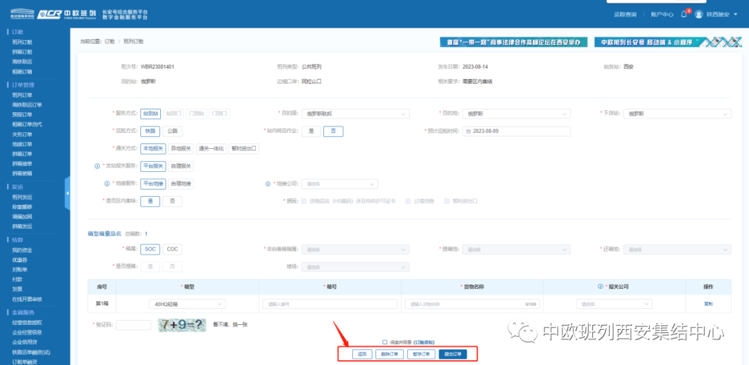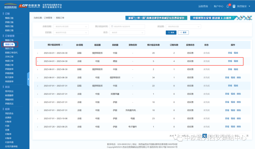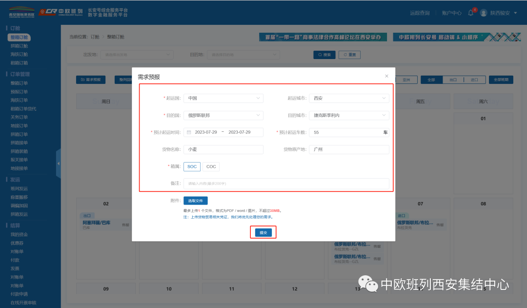 亲爱的客户朋友们!长安号自贸港俄罗斯线路舱位需求预定功能上线啦!即日起,若您有发运需求,可在我司订舱系统提报未来三个月的订舱需求,我司工作人员后台审核后,完成订舱操作。具体怎么操作呢?我们一起来看看吧~