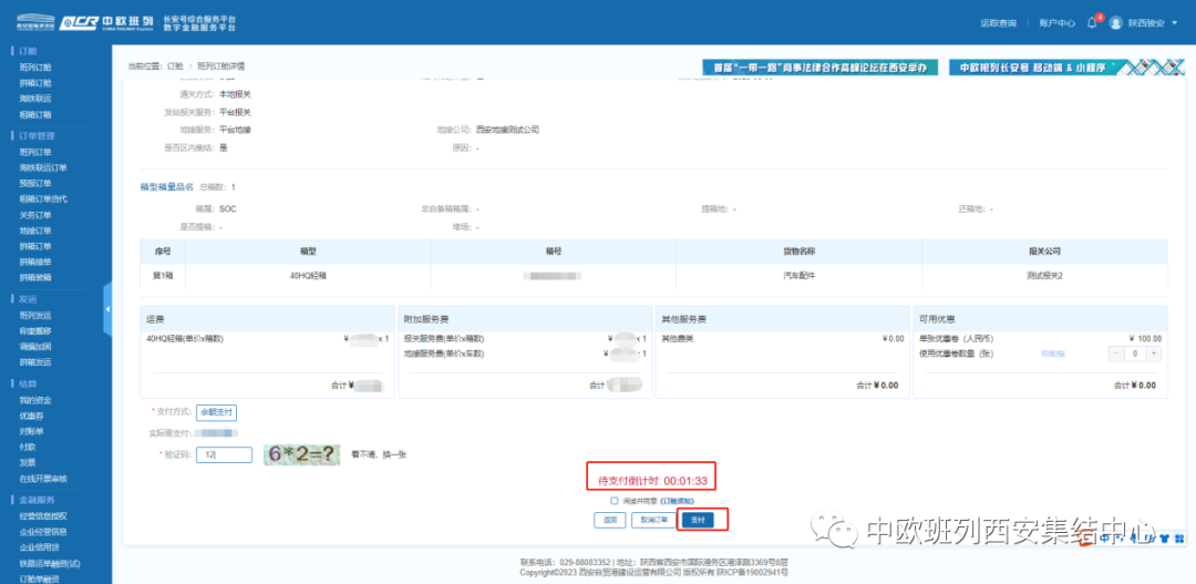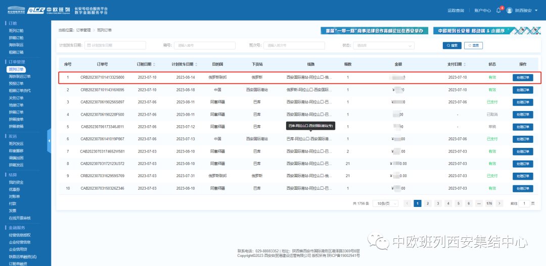 在下单页面填写完信息,点击【提交订单】,即可进入待支付页面,支付完成后,在班列订单中查看订单,点击【处理订单】即可查看订单详情。