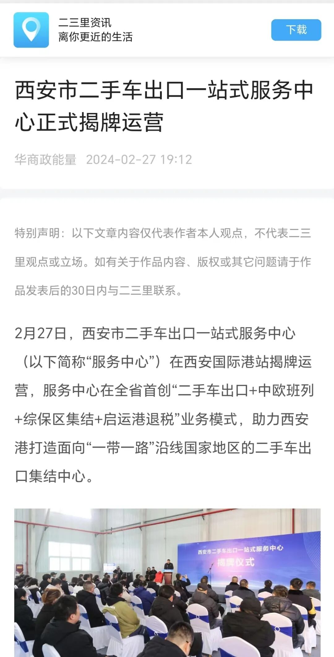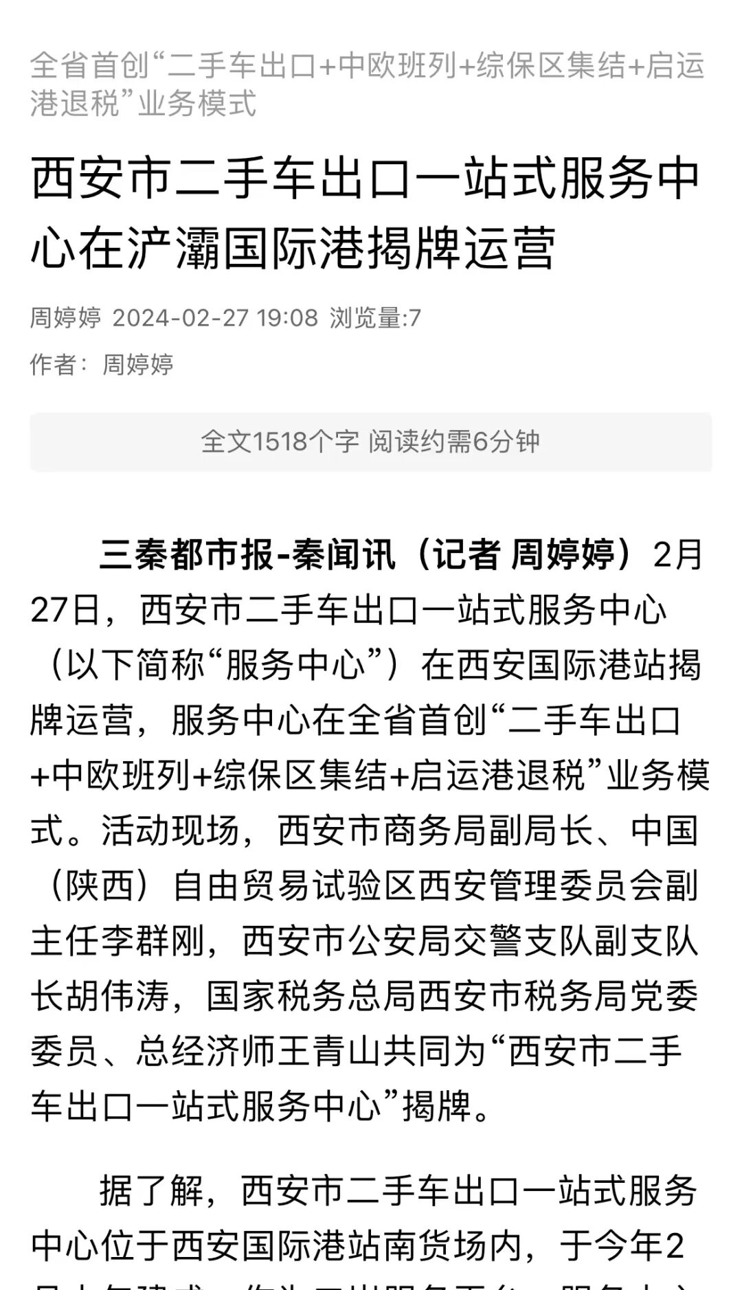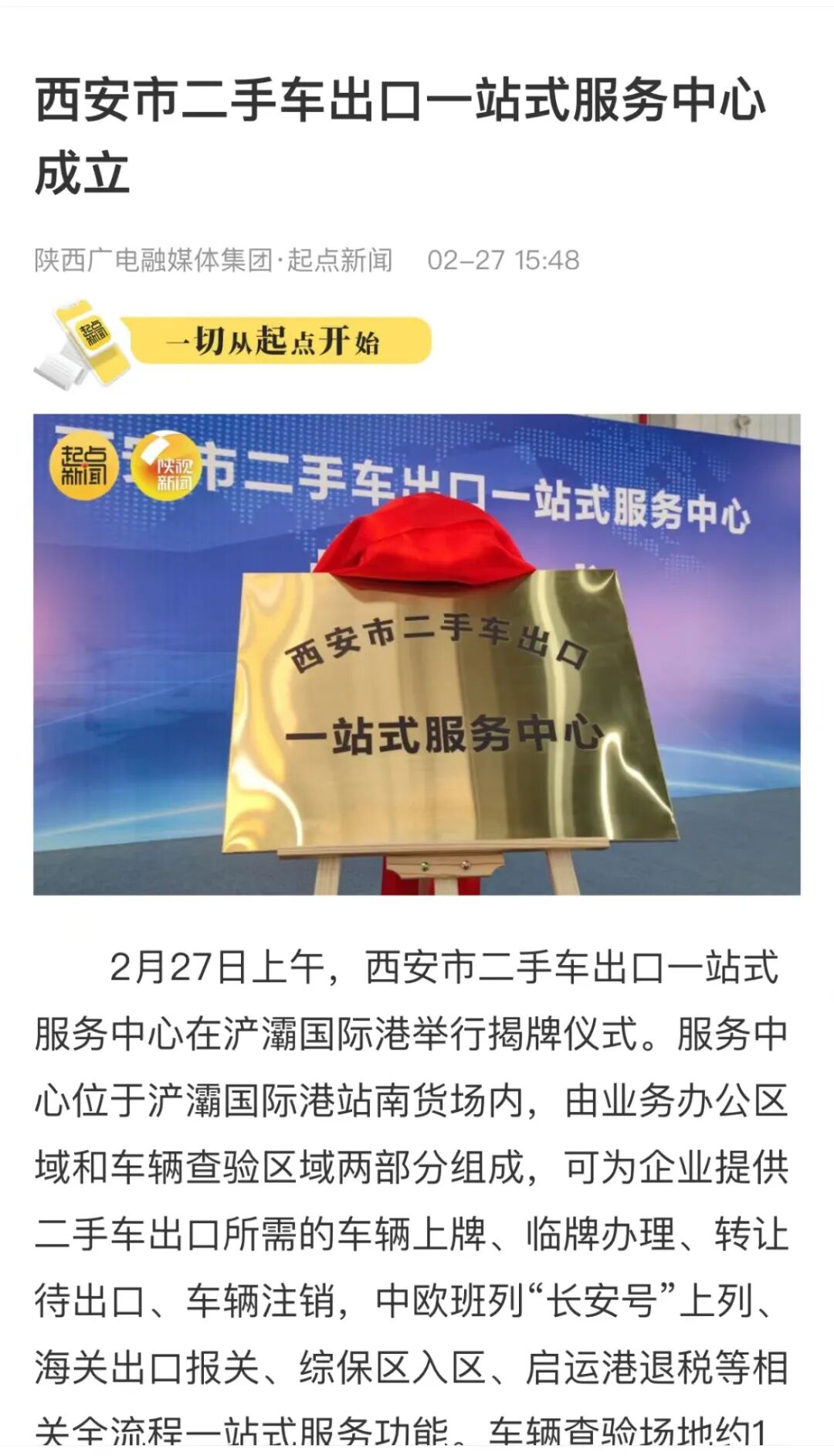“西安市二手车出口一站式服务中心的设立是我们积极落实中国—中亚峰会成果的重要举措,二手车出口业务已成为全市开放型经济发展的新亮点。服务中心系统集成了中欧班列长安号的通道优势,综合保税区的平台优势和启运港退税的政策优势,在全省首创‘二手车出口+中欧班列+综保区集结+启运港退税’的业务模式,可为国内二手车出口企业提供全流程‘一站式’服务,将助力西安港打造面向‘一带一路’沿线国家地区的二手车出口的集结中心。