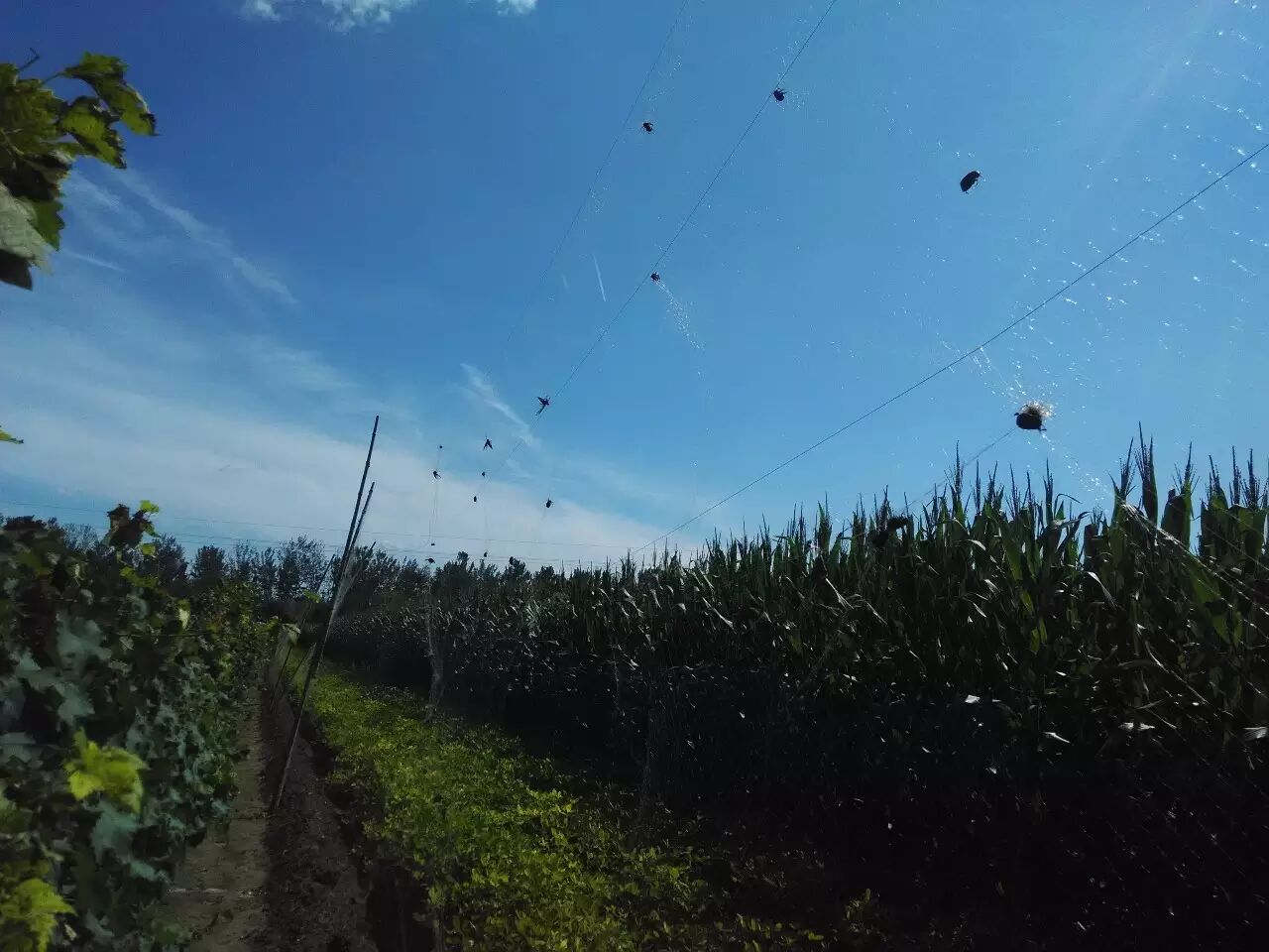 (图4 粘网:葡萄地的两边都有一行挂着鸟网的竹竿,上面有不少知了、蜻蜓和已经风干的死鸟)