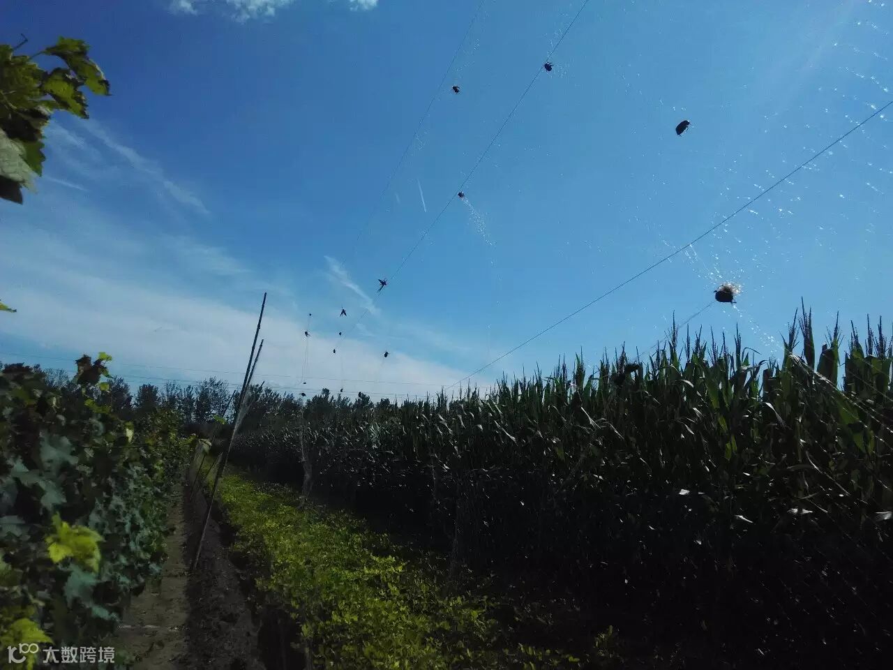 在采育西一村公交站附近,穿过葡萄园之间的路来到后面的园子。一个葡萄园园里边挂着四个粘网,上面有许多死去的鸟与昆虫尸体,其中一只应该当天死亡的,而对面一个葡萄园的网则比较隐蔽,在外面并不全园子内部的情况,具体粘网数量不详。而一旁就有使用那种白色粗网将整块地罩住和使用驱鸟带等对鸟无伤害的防鸟方式。继续往后,又有一条横着的水泥马路,往镇上有房子那边走去,路上有一片片的玉米地,还有几个葡萄园。其中一家,有大概五个粘网,上面一样挂着一些死鸟,更令人诧异的是粘网旁边竖着几根竹竿,每根竿子上面挂着一个鸟的尸体,其中喜鹊居多。