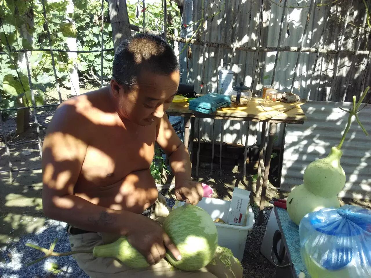 我探头望向园里,一位光着膀子晒得黝黑的大叔正坐在斑驳的阳光里削葫芦。打过招呼后我们聊起天来。他姓赵,是园里的主人,种葡萄已有三十年。赵大叔对于自家葡萄很自信、自豪:“来我家的都是老顾客,有的人吃我家葡萄二十多年,他们早就预订了……”