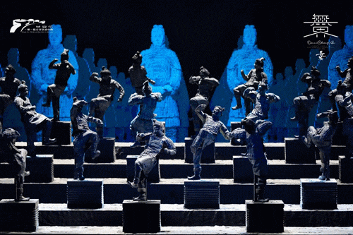 不论是流于表象的声光电,还是秀于其中的诗舞乐,抑或是星罗点缀的金木水火土元素。一切舞台上听到的,看到的,都不过是将人们心中的理想做了具象化。譬如舞台上向天挥舞的秦俑,站立是勇士,倒下便是疆土,支撑他千年不倒的是一个民族刚劲的节气。