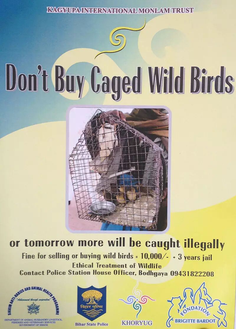 延续动物义诊的精神,噶举大祈愿法会与法王噶玛巴旗下的「环境保护组织」(Khoryug)、「碧姬.芭铎基金会」(The Foundation Brigitte Bardot)以及锡金政府的「莎冉」(SARAH)组织携手合作,在当地警察的支持下,于菩提迦耶及其临近地区展开海报宣传,遏止对野生鸟的交易。