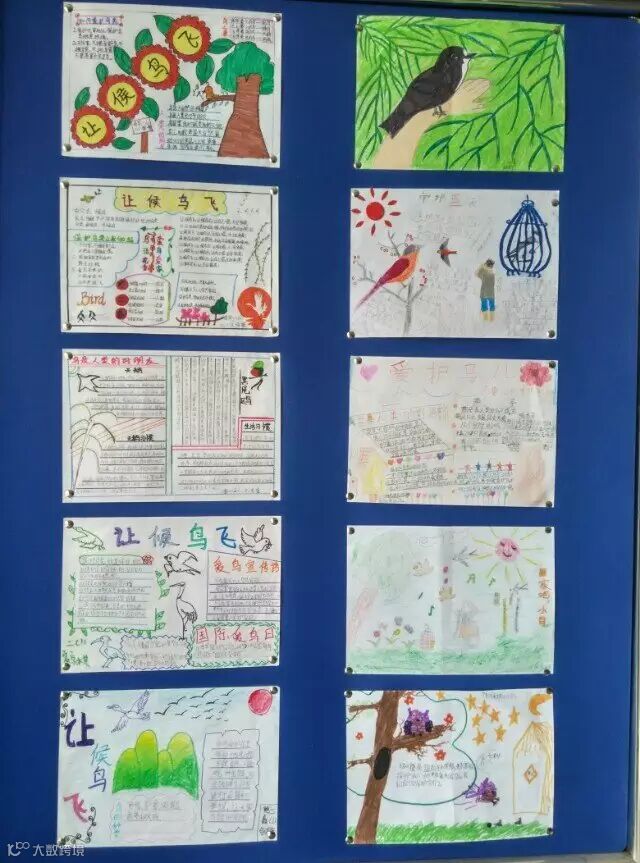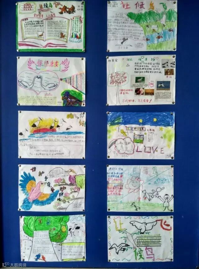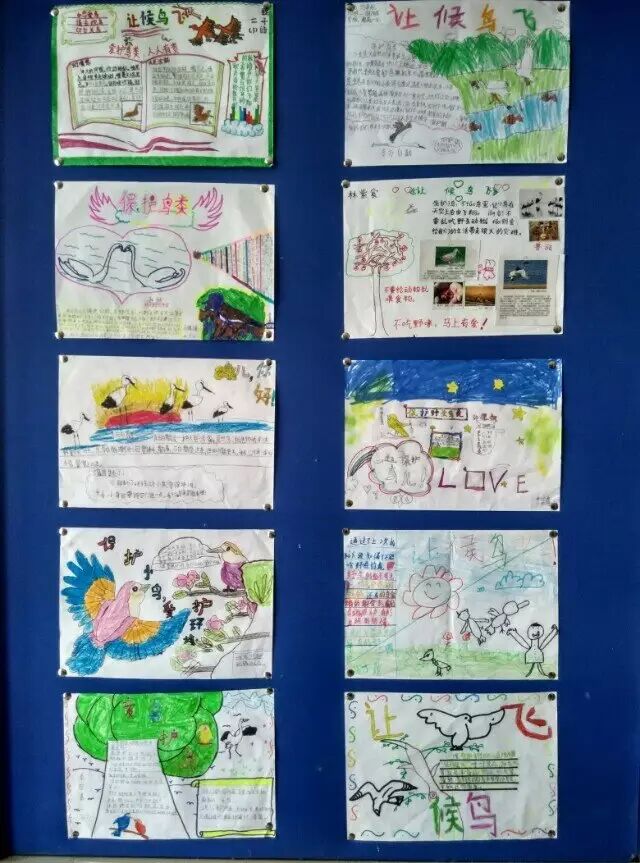 近六十分钟的讲座结束了,同学们仍然意犹未尽,但总算是“乘兴而来,满载而归”,收获颇丰。课后孩子们纷纷讨论,有的说:鸟和人类是一家人,现在还是有人在捕鸟、杀鸟、吃鸟,如果看到的话,我们都应该去制止。有的说:通过这个讲座,我还知道了原来可以通过声音去辨别它们;有的说:我们要保护栖息地,让鸟儿有温暖舒适的窝;有的说:我还知道我们看到街上有卖野鸟的时候不能购买,还可以举报。因为没有买卖就没有杀戮;有的说:通过今天的讲座,我发现鸟也有很多独特之处,激发了我观鸟的兴趣;还有的说:不要去追赶在路边的小鸟,人与鸟应该和谐相处,我们应该保护它们,保护它们赖以生存的家园。讨论之后,同学们精心制作了爱鸟手抄报,并评选出了优秀的作品张贴在学校的展板上,供大家相互学习和宣传。