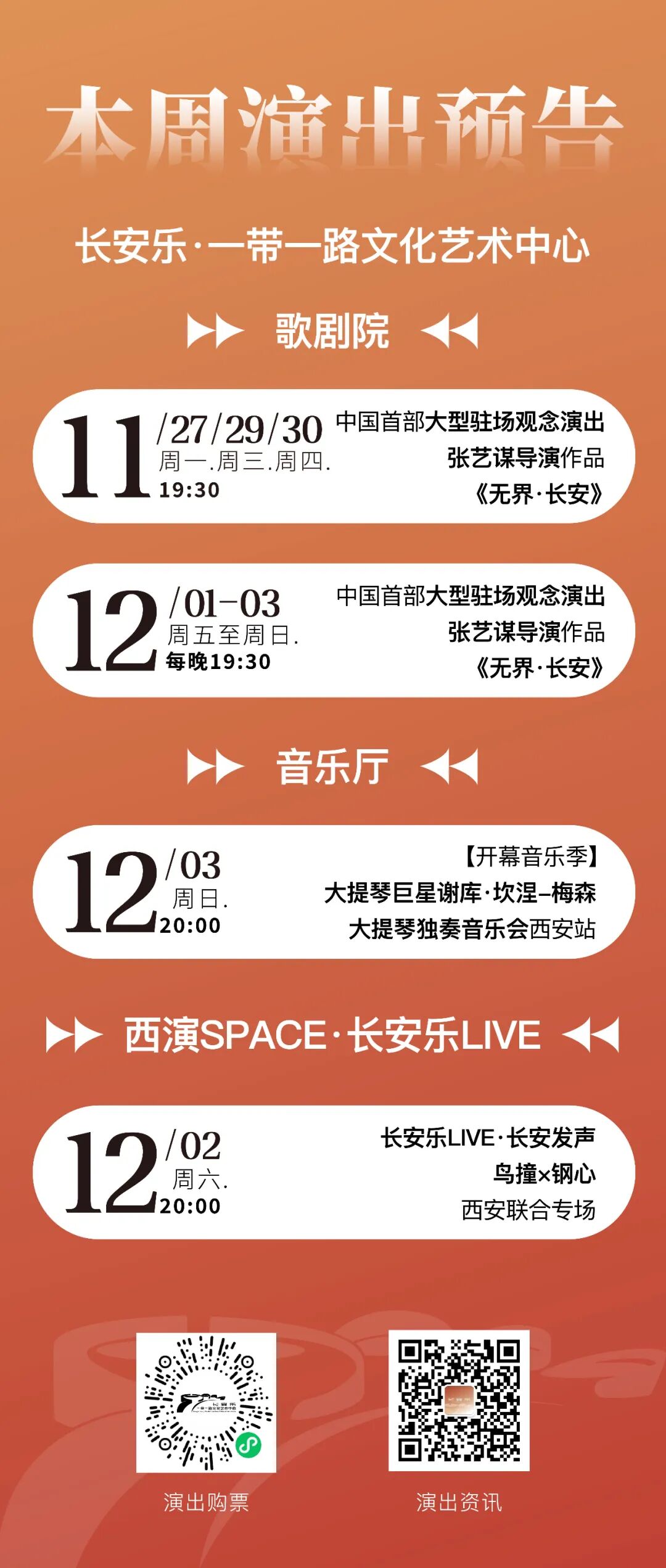 除本周二之外,由总导演张艺谋、总制作人沙晓岚“巅峰组合”的《无界·长安》,将于每晚19:30在长安乐·歌剧院重磅上演。