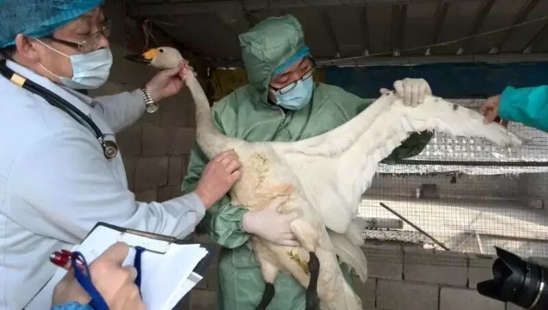 (图:2014年3月,济宁森林公安查获时发现天鹅等珍禽的翅膀都被剪残,图为兽医志愿者检查天鹅受伤和疫病情况)