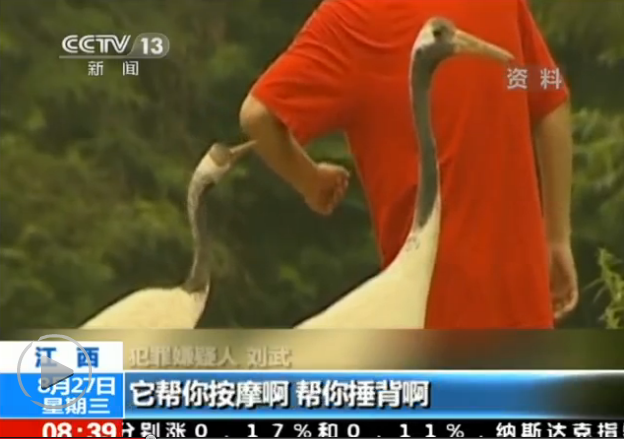 上图出自央视新闻截屏,当记者问“你们(指刘武和鸟)之间好到什么程度呢”?刘武说“它帮你按摩啊,帮你捶背啊”。