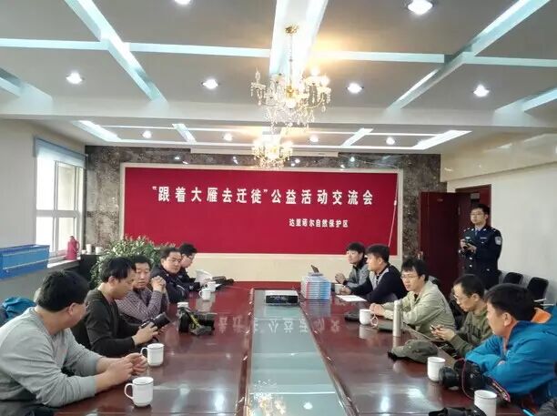 下午4点,达里诺尔自然保护区有关部门组织了“跟着大雁去迁徙”公益活动交流会,与西线活动工作组交流研讨当地湿地和候鸟保护问题。