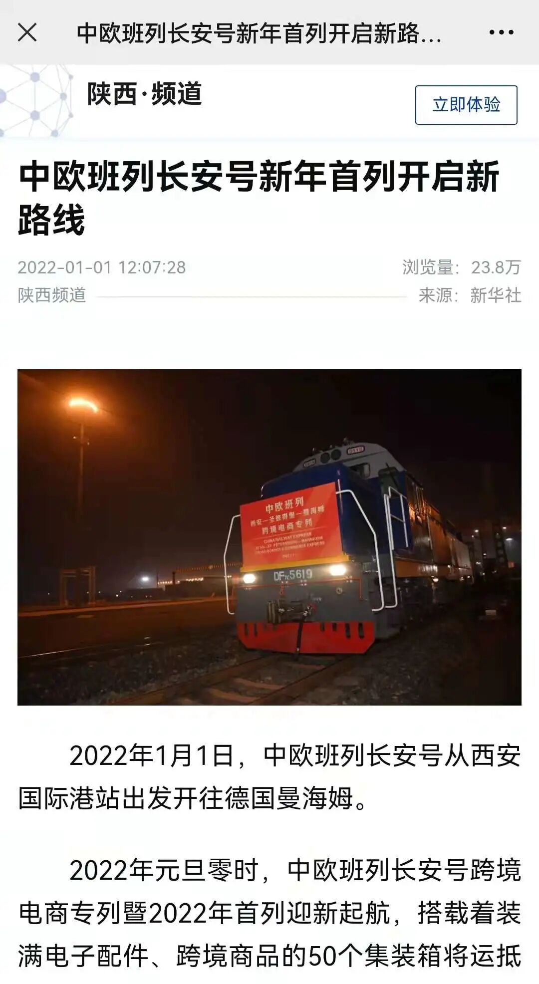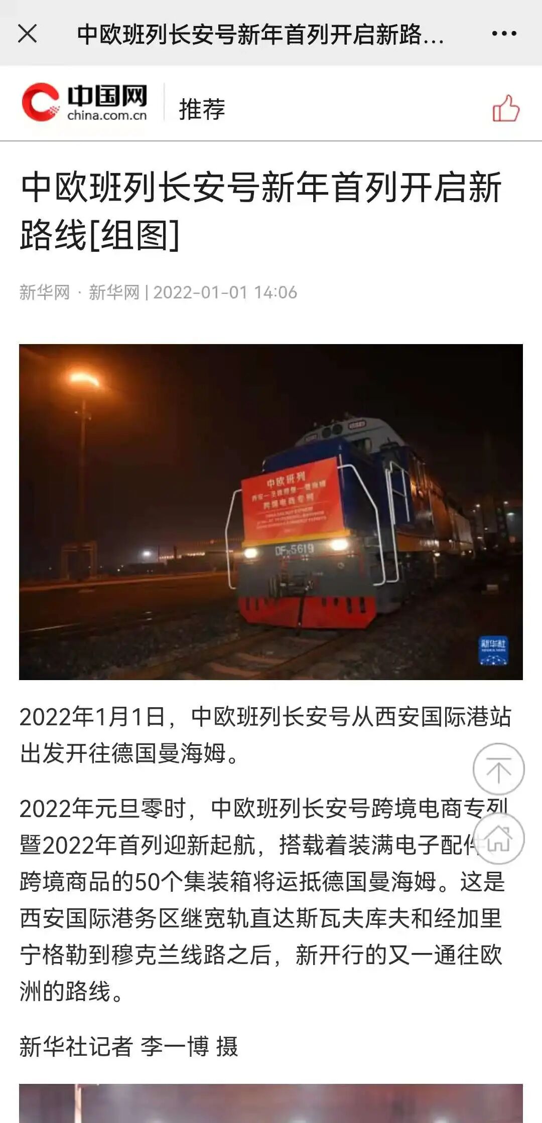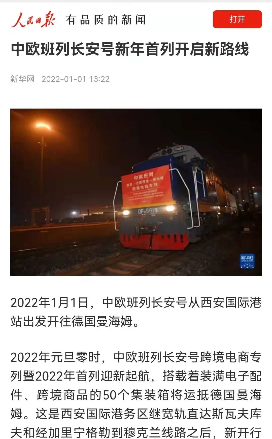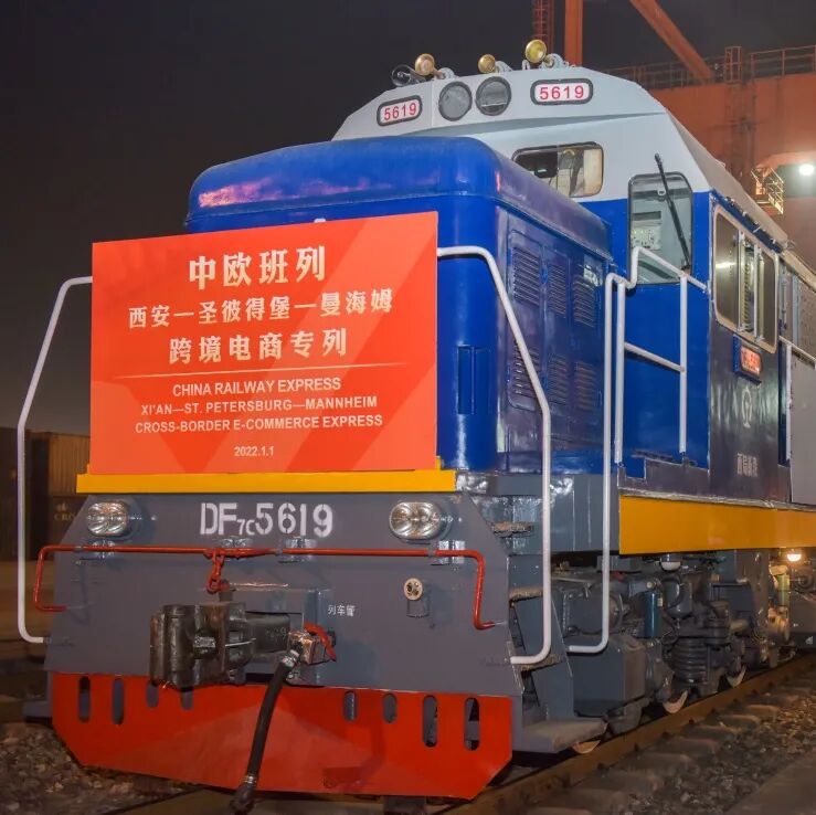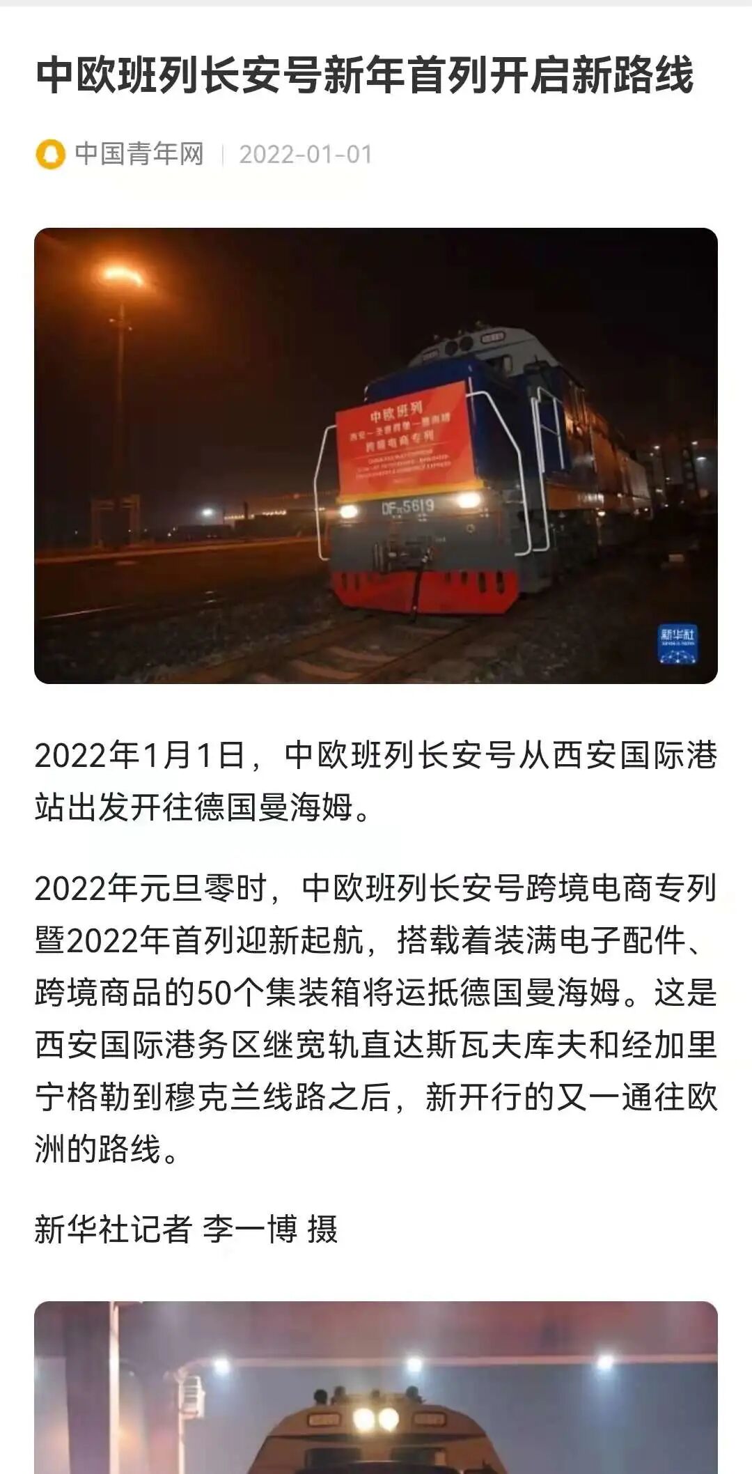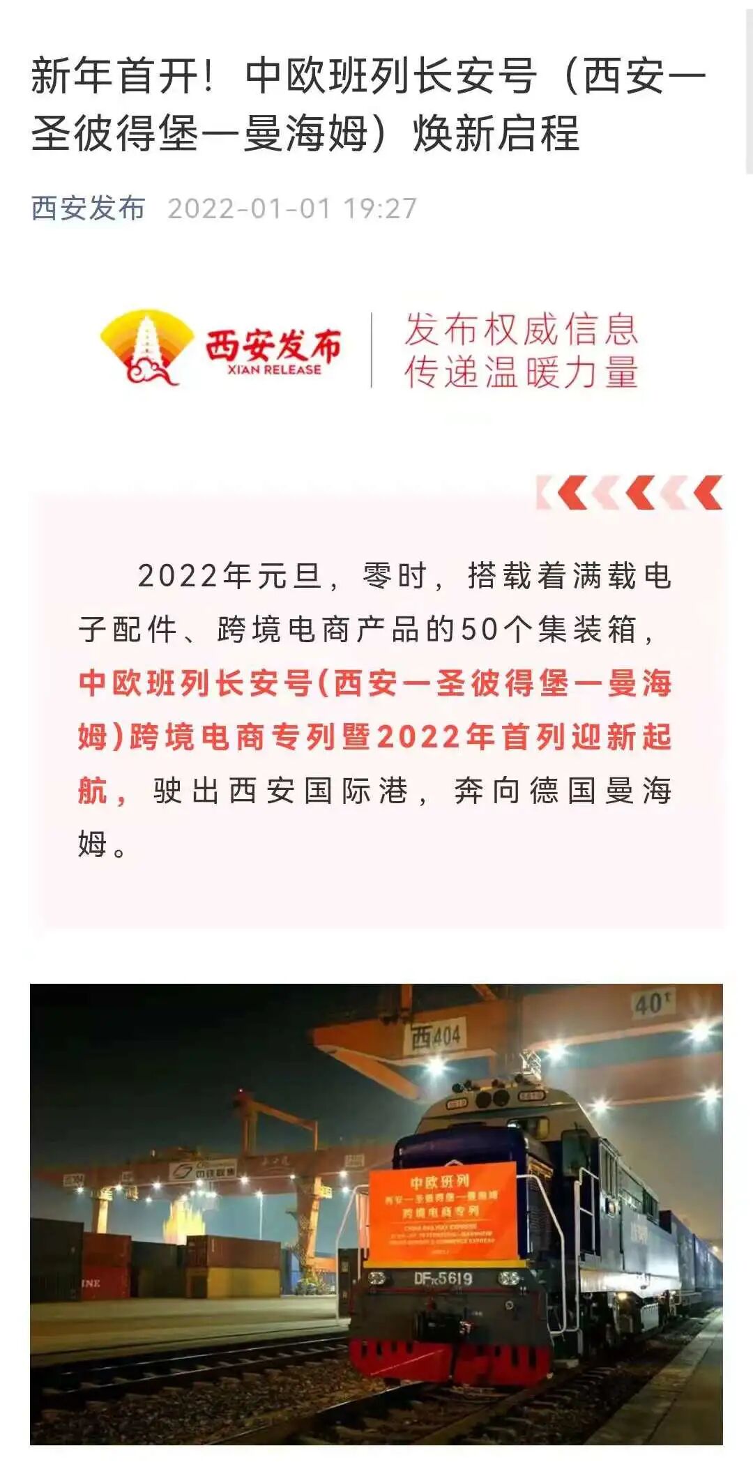 2022年元旦,零时,搭载着满载电子配件、跨境电商产品的50个集装箱,中欧班列长安号(西安—圣彼得堡—曼海姆)跨境电商专列暨2022年首列迎新起航,驶出西安国际港,奔向德国曼海姆。