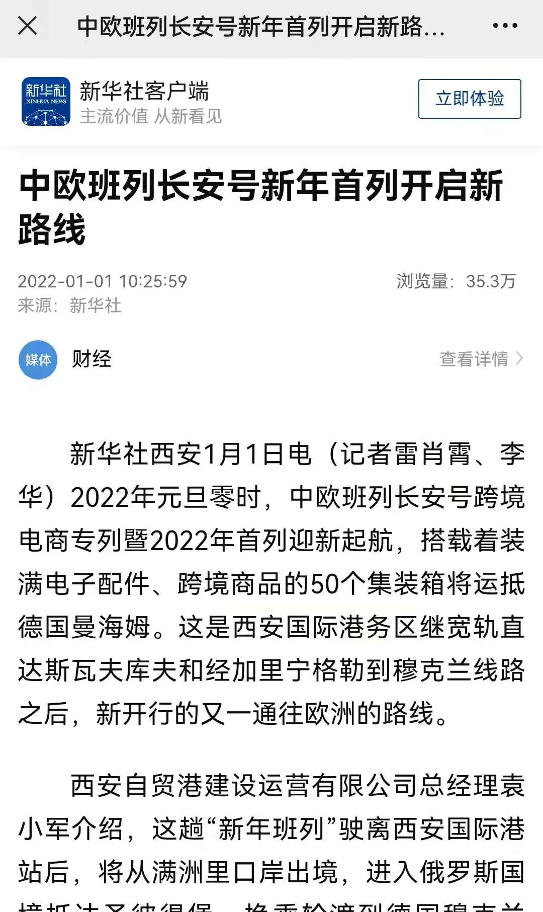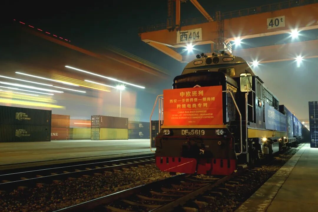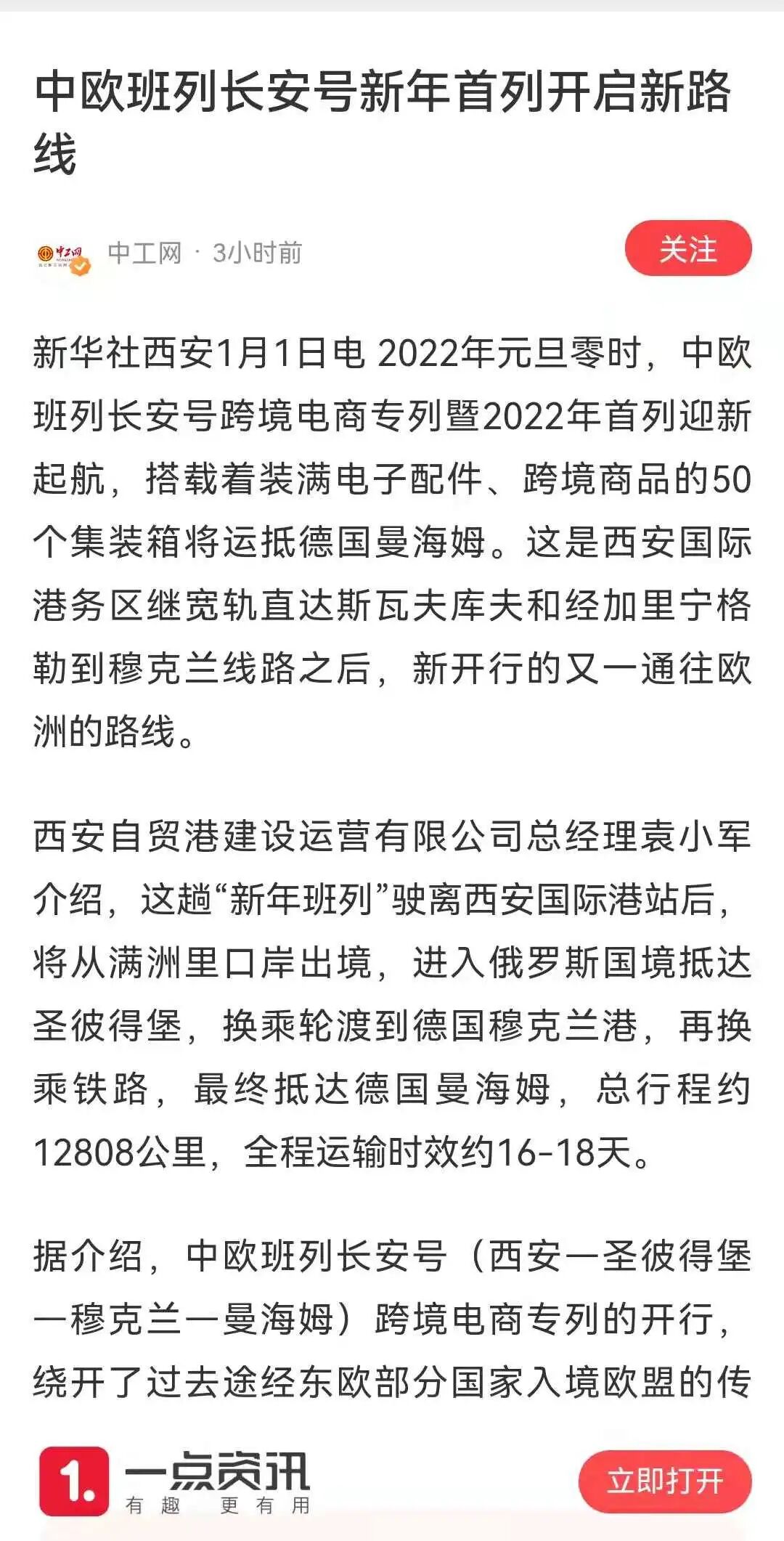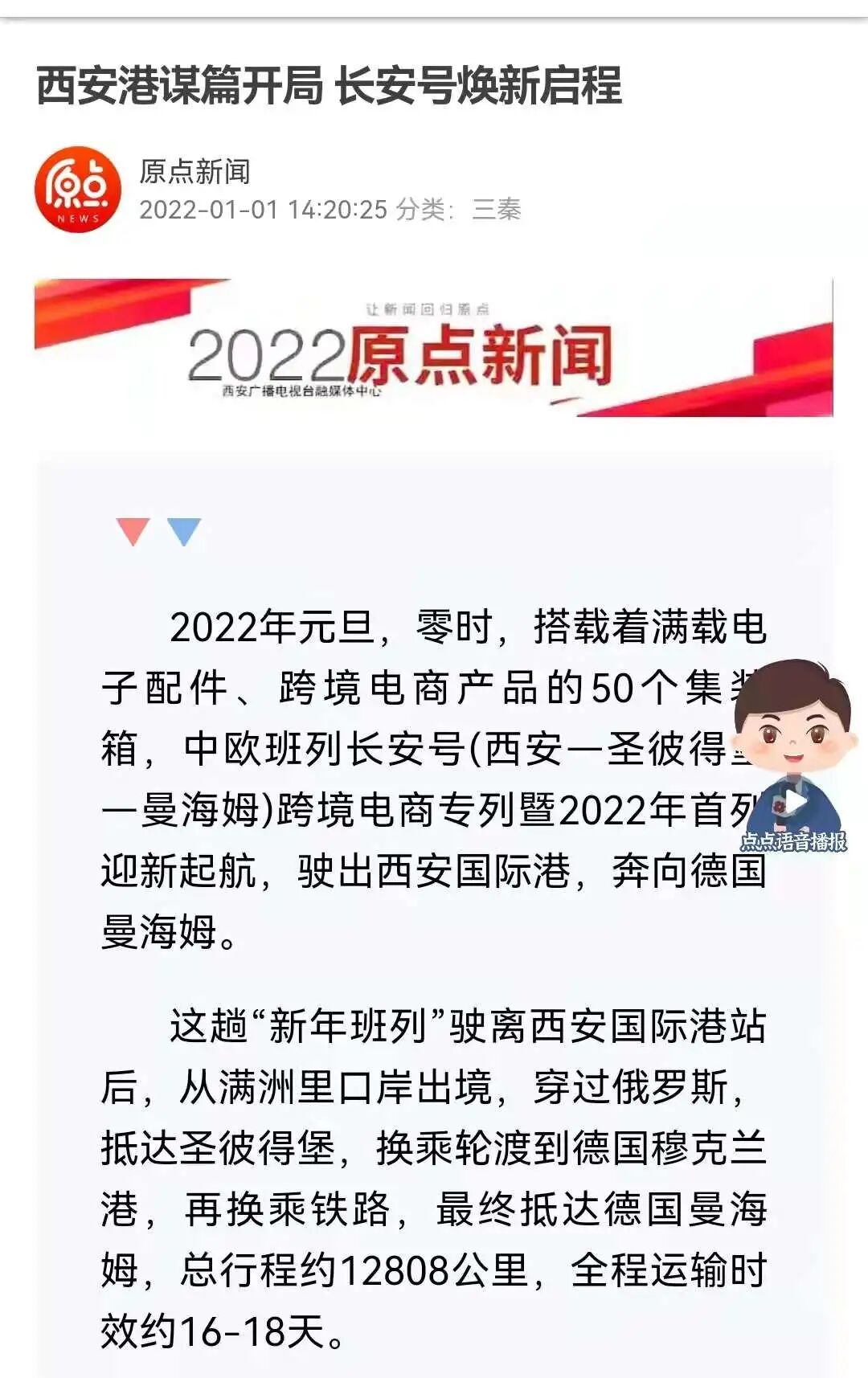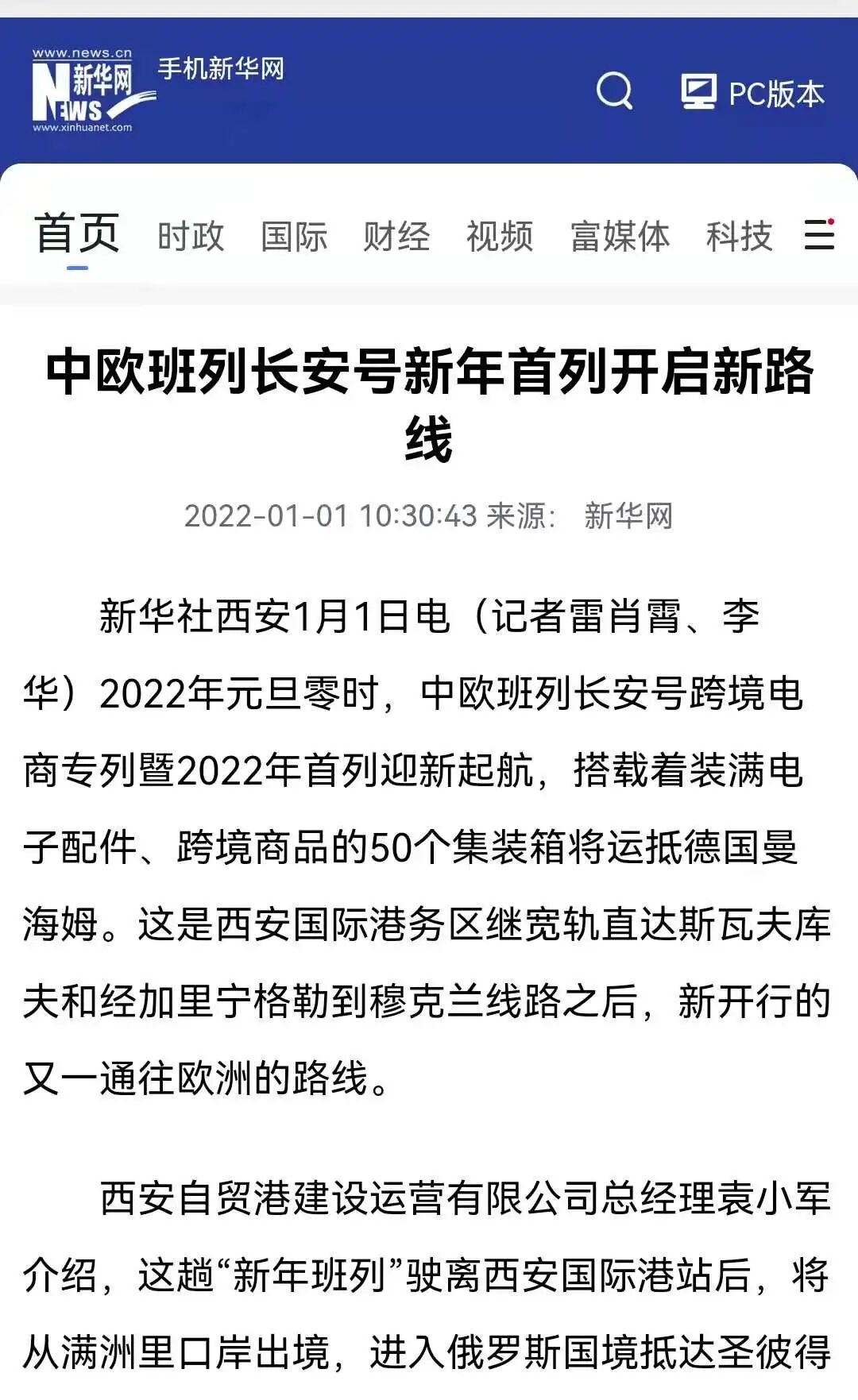 2022年元旦,零时,搭载着满载电子配件、跨境电商产品的50个集装箱,中欧班列长安号(西安—圣彼得堡—曼海姆)跨境电商专列暨2022年首列迎新起航,驶出西安国际港,奔向德国曼海姆。