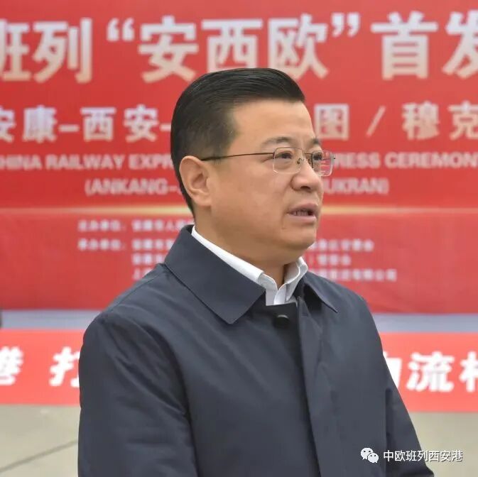 安康市委副书记、市长赵俊民;省政府口岸办专职副主任陶绍卿;省发改委副主任苏园林;省交通运输厅二级巡视员鲁会劳;西安市政府副秘书长黄晓华;西安海关副关长杨占强;中国铁路西安局集团有限公司中欧班列运输协调组组长闫战国;上港集团物流有限公司党委书记任海平;西安国际港务区管委会副主任苏国峰出席发车仪式。安康市委常委、常务副市长高晶华主持仪式。
