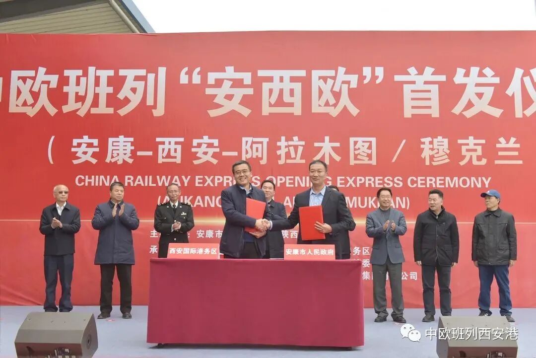 发车仪式现场,安康市政府副秘书长杨克山与西安国际港务区管委会副主任苏国峰签署《开行中欧班列“安西欧”合作协议》。