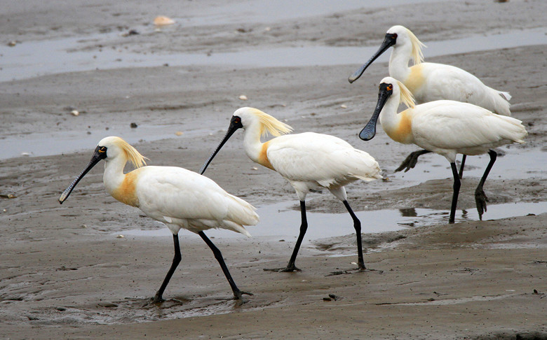 在泥滩上觅食的黑脸琵鹭 (摄影:周海翔)
