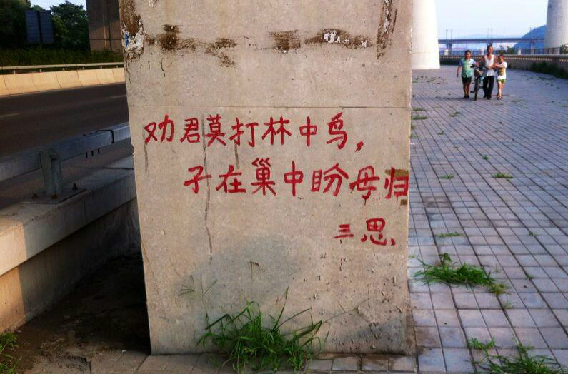 在水库旁的桥墩下我们看到有人用红色油漆留下“劝君莫打林中鸟,子在巢中盼母归,三思。”字样。可见这里不仅有我们的爱鸟正义朋友,肯定也存在悲惨的杀戮。希望能唤起更多人的良知……也庆幸有护鸟人的存在。