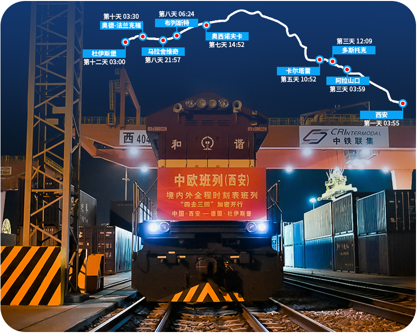 中欧班列(西安—杜伊斯堡)境内外全程时刻表班列由西安国际陆港集团多式联运公司运营。2022年10月,在国铁集团的指导下,在西安浐灞国际港管委会、中国铁路西安局集团有限公司、西安海关的大力支持下,西安国际陆港集团多式联运公司积极与西安车站海关、中铁集装箱西安分公司公司、中铁多联西安分公司公司以及中铁联集西安中心站沟通协作,在全国首发中欧班列“境内外全程时刻表班列”。自2024年6月15日起,中欧班列(西安)全程时刻表班列实现每周“四去三回”,成为全国开行密度最大的全程时刻表班列,单程运输时间稳定在12天内,为共建“一带一路”高质量发展提供充足的运能保障。