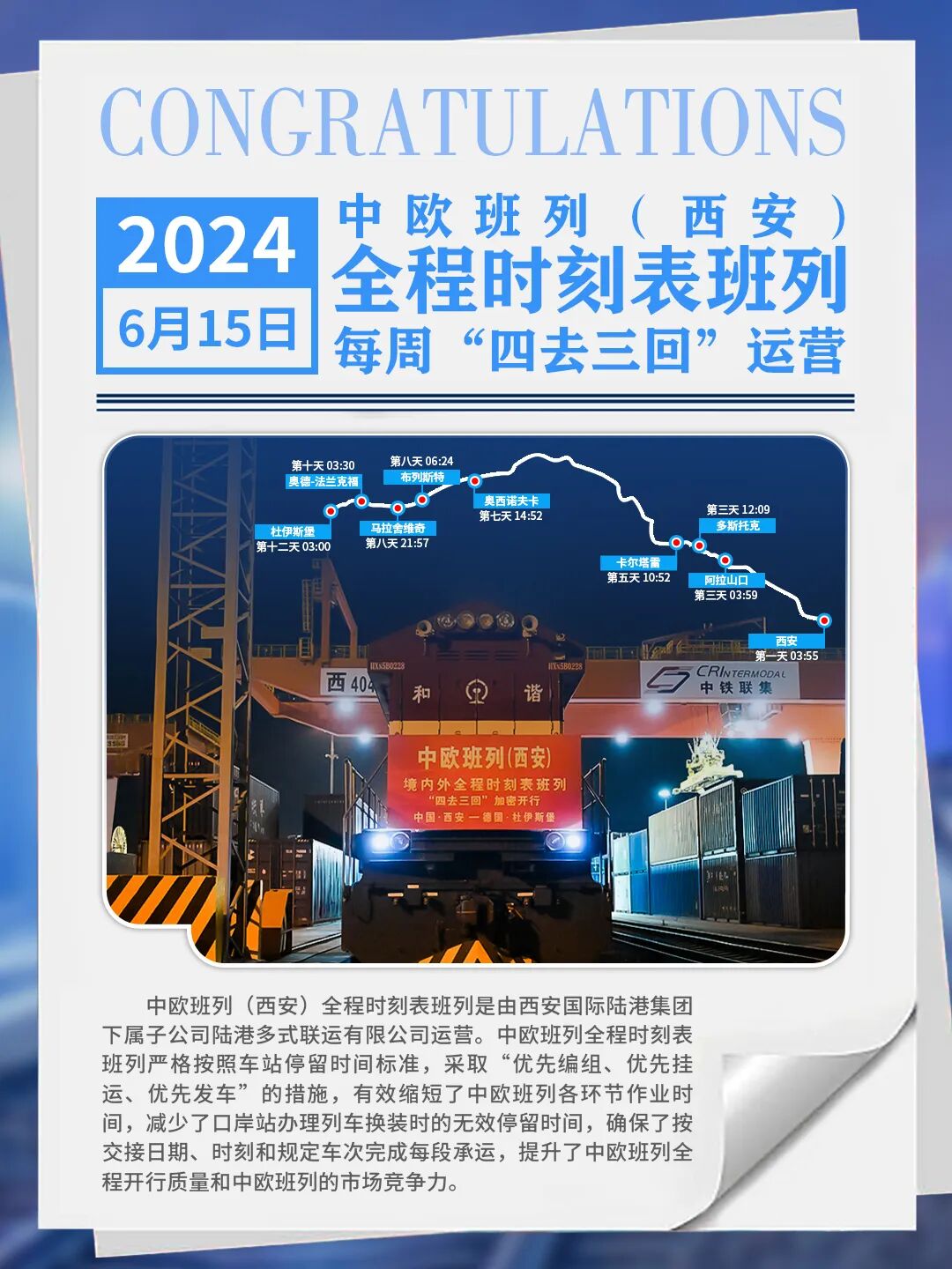 截至目前,国内开行中欧班列的有100多座城市,仅有西安、成都、武汉、重庆、义乌、广州被纳入全程时刻表班列开行城市之列。西安作为全国首个开行全程时刻表班列的始发(终到)城市,自6月15日起,中欧班列(西安)全程时刻表班列实现每周“四去三回”,成为全国开行密度最大的全程时刻表班列,单程运输时间稳定在12天内,为共建“一带一路”高质量发展提供充足的运能保障。